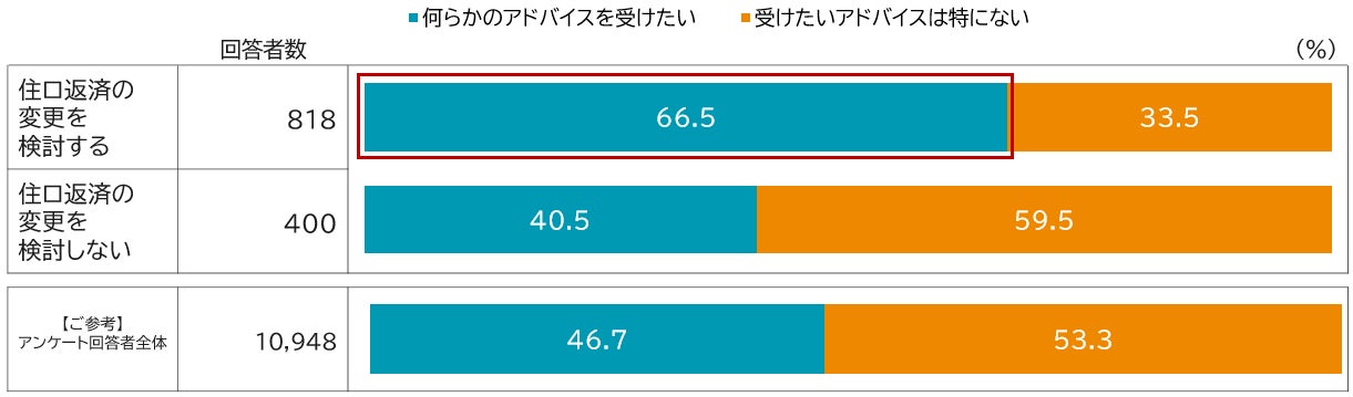 ●変更を「検討する人」の方が、「金融リテラシーセミナーへの参加希望」や「金融機関・ファイナンシャルアドバイザーからのアドバイス希望」が多く、受けたいアドバイス内容としては、「現在および将来のマネープラン」「老後資金のマネープラン」「NISA・iDeCoなど、貯蓄・投資に関する優遇制度」