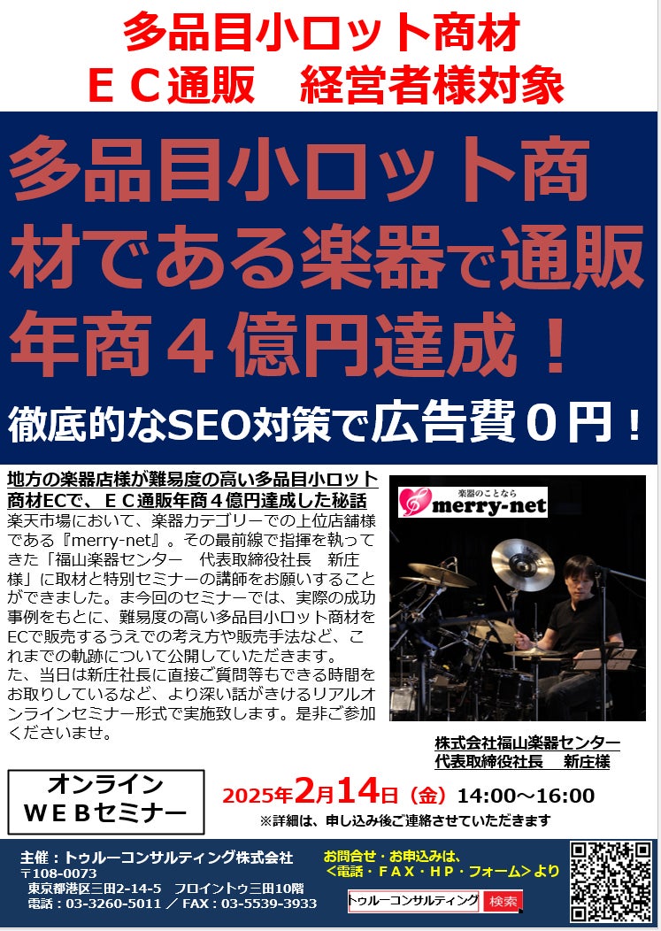 トゥルーコンサルティング株式会社(本社:東京都港区、代表取締役:萱沼 真吾)は、地方の楽器店である福山楽器センター様が、年商6000万円からEC事業を核とした事業を展開し、年商4~5億円まで拡大させてきた、立ち上げから現在の運営体制などを赤裸々に語っていただきました。逆境からの立上げで、価格競争に陥りがちな楽器EC事業をいかにして、非常識な高収益を上げているのかなどをお聞きしたセミナーを2025年2月14日に開催いたしました。今回、そのセミナーのダイジェスト版の動画を2月20日に公開したことをお知らせいたします!
