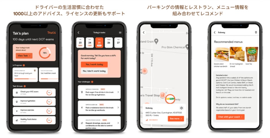 糖尿病の専門資格をもつヘルスケアスペシャリスト、管理栄養士、商業運転ライセンス認定の専門資格を持つスペシャリストと専用にトレーニングされたAIにより24時間のチャットおよび電話での生活習慣サポートを行います。また、ライセンス更新に必要な書類のオンライン作成をサポートしたり、トラックを停車できるパーキングの近隣レストランの情報提供、食事指導の目標にあったメニューの組み合わせのレコメンドも行います。