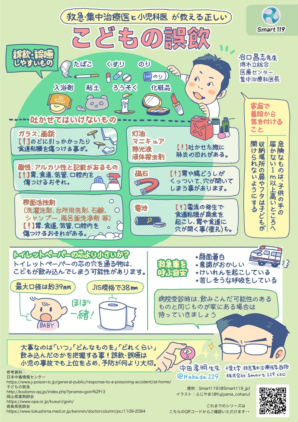 千葉大学発医療スタートアップ企業である株式会社Smart119(本社:千葉県千葉市、代表取締役社長/CEO:中田孝明)は、こどもの誤飲についてのイラストレーションを、本日一般公開しました。家庭にはこどもが誤って飲み込んでしまうものが多くあり、誤飲・誤嚥事故により口腔内、気管、食道、胃が傷ついたり、あるいは気道が詰まって窒息したりして救急搬送されるケースが多発しています。救急集中治療医と小児科医の見地から、こどもの誤飲・誤嚥の予防方法などを親しみやすいマンガで解説します。本資料は学校、企業、公共機関、町内会等で自由に配布・利用していただくことが可能です。
