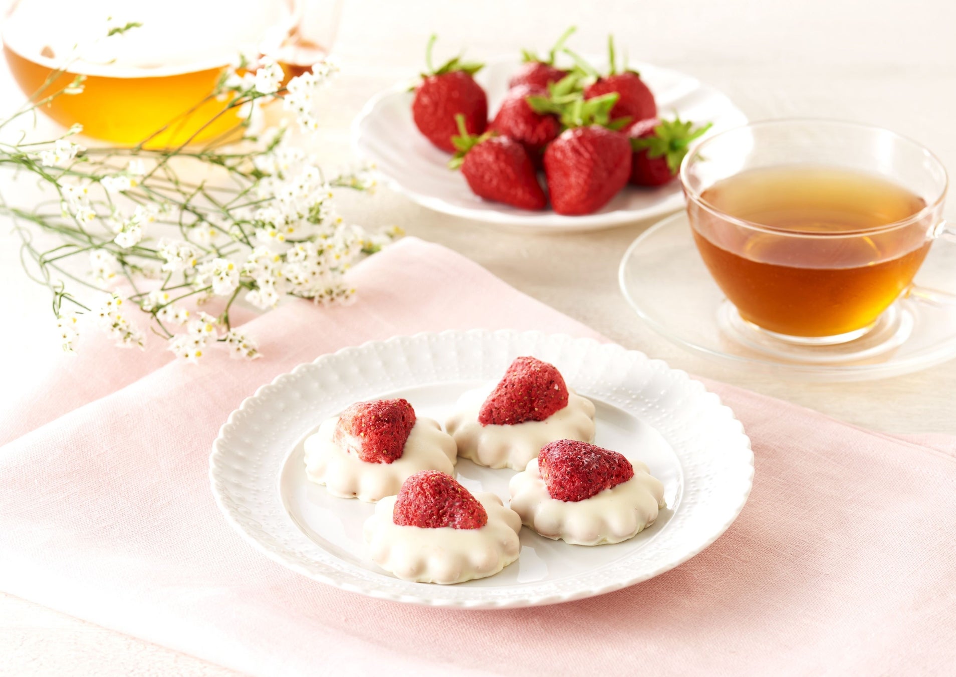 苺ペーストとフリーズドライ苺、練乳を加えた「いちごミルク」テイストのクッキーを、生クリームのような味わいのホワイトチョコレートで包み込みました。トッピングには、チョコレートを染み込ませた風味豊かな国産いちご「紅ほっぺ」を贅沢に使用し、まるでショートケーキのようなクッキーに仕立てました。