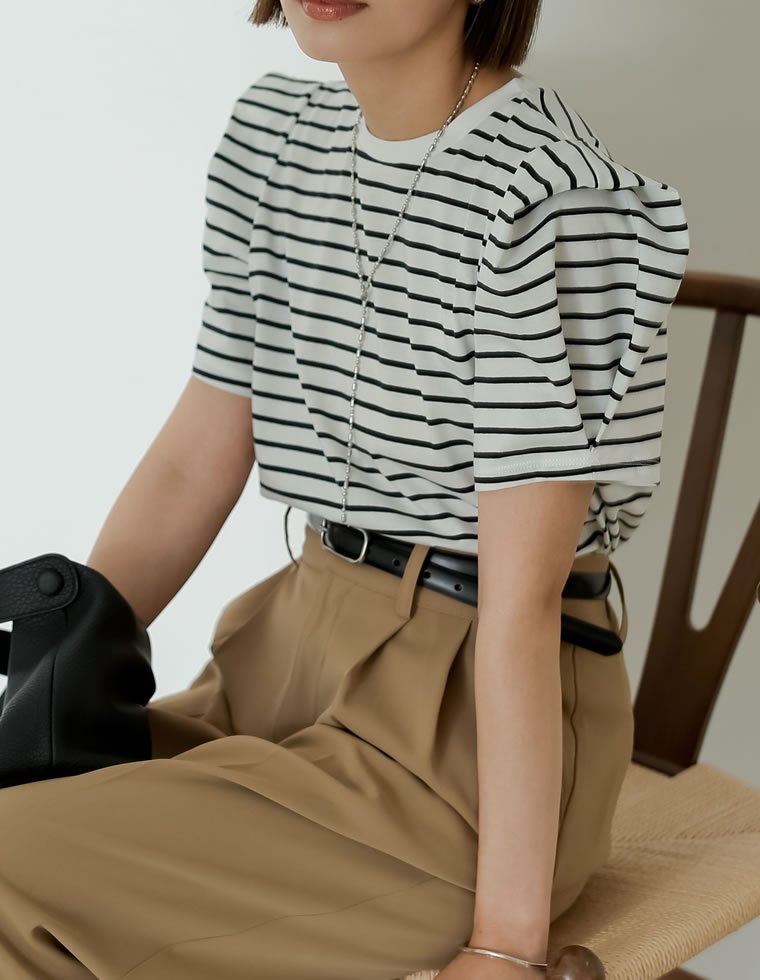 [接触冷感]無地orボーダーパワショルデザインカットソーTシャツ