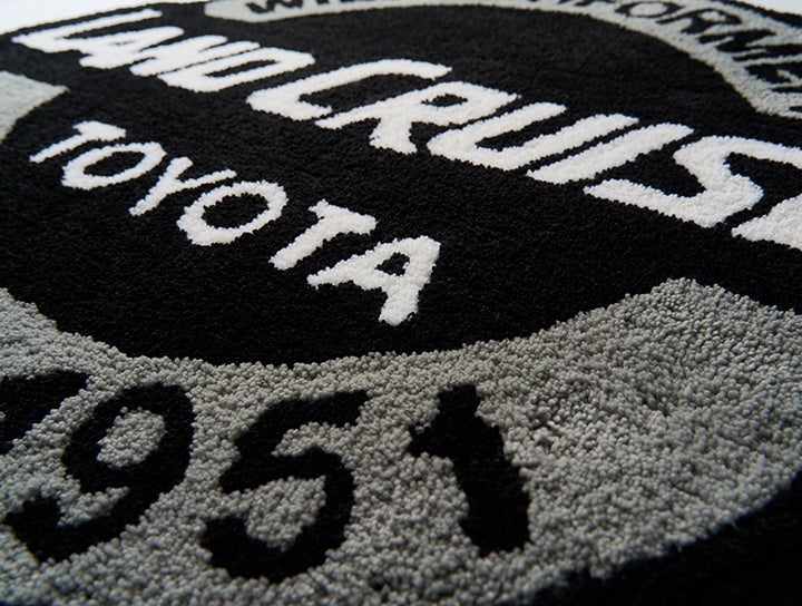 クラシックなランドクルーザーロゴを中心に、ラグマットとしての使い勝手やデザインとしての安定感がある円形で製作しました。円部分の直径で約73.5cmと、使いやすいサイズ感です。