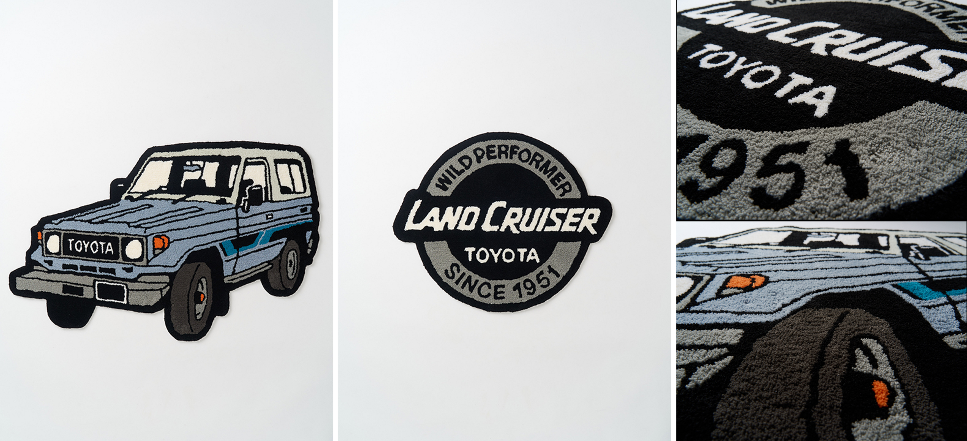 丁寧で伝統的なモノづくりを大切にしながら、現代的な価値観のアイテムを発表する姿勢に共鳴し、今回のコラボレーションが実現しました。本コラボレーションでは、歴代ランドクルーザーの中でも、過去から現在に至るまで一貫して多くのお客様から愛され続ける“70”シリーズの車型を堂々とマットに落とし込んだ『VEHICLE RUG』と、ロゴをエンブレム風にあしらった『CIRCLE RUG』の2種類を、オンラインストアのみで限定数量にて発売いたします。