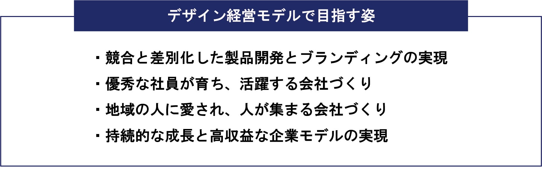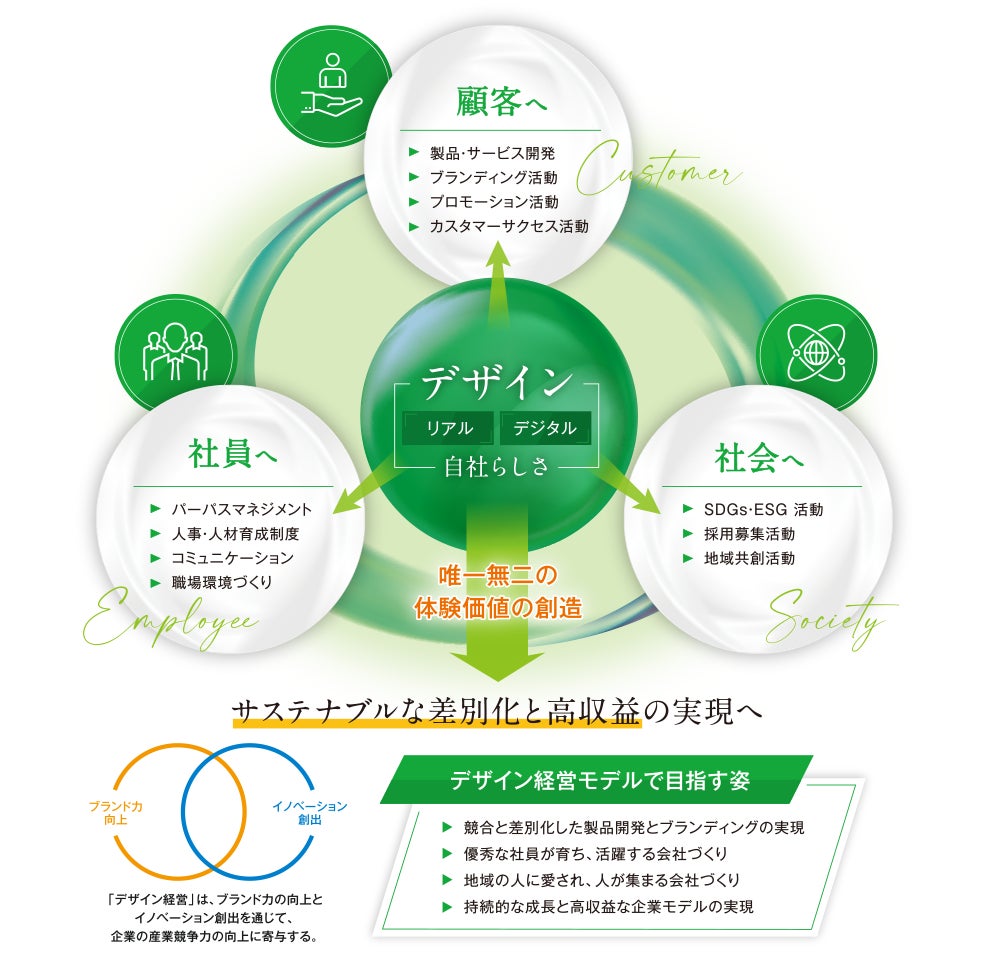 従来、デザインは主に自社と他社の製品の差別化のために活用されてきました。しかし、「モノ・情報・サービス・企業」の同質化が進む現代社会の中で、デザインは企業やビジネスモデルそのものを差別化する経営資源として活用が進んでいます。デザインは受け手側の「体験価値」を高め、魅力ある自社らしさを醸成します。デザイン経営とは、全方位にデザインの力を活用する、高収益経営モデルです。