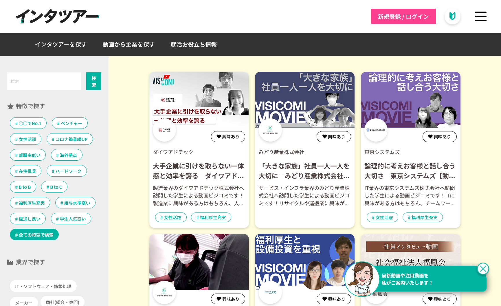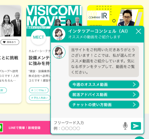 「インタツアームービー」は企業発信の動画コンテンツを配信するだけでなく、学生が「インタツアー」で企業にインタビューした内容をまとめたクチコミ「ビジコミ動画」を掲載。学生目線からのライブ感の高い企業情報を提供します。また、多数の動画をスムーズに閲覧するアシスタントとして「コンシェルアバター」を設置。チャットを通して動画おすすめや企業へのよくある質問・回答対応が可能です。