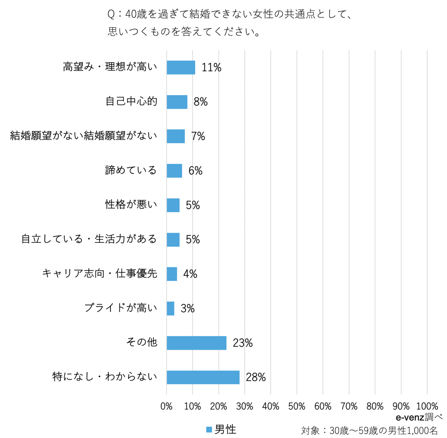 結婚できない女性の特徴や共通点について調査すべく、今回e-venzでは30代から50代の既婚男性を対象に結婚できない女性に関するアンケート調査を実施しました。