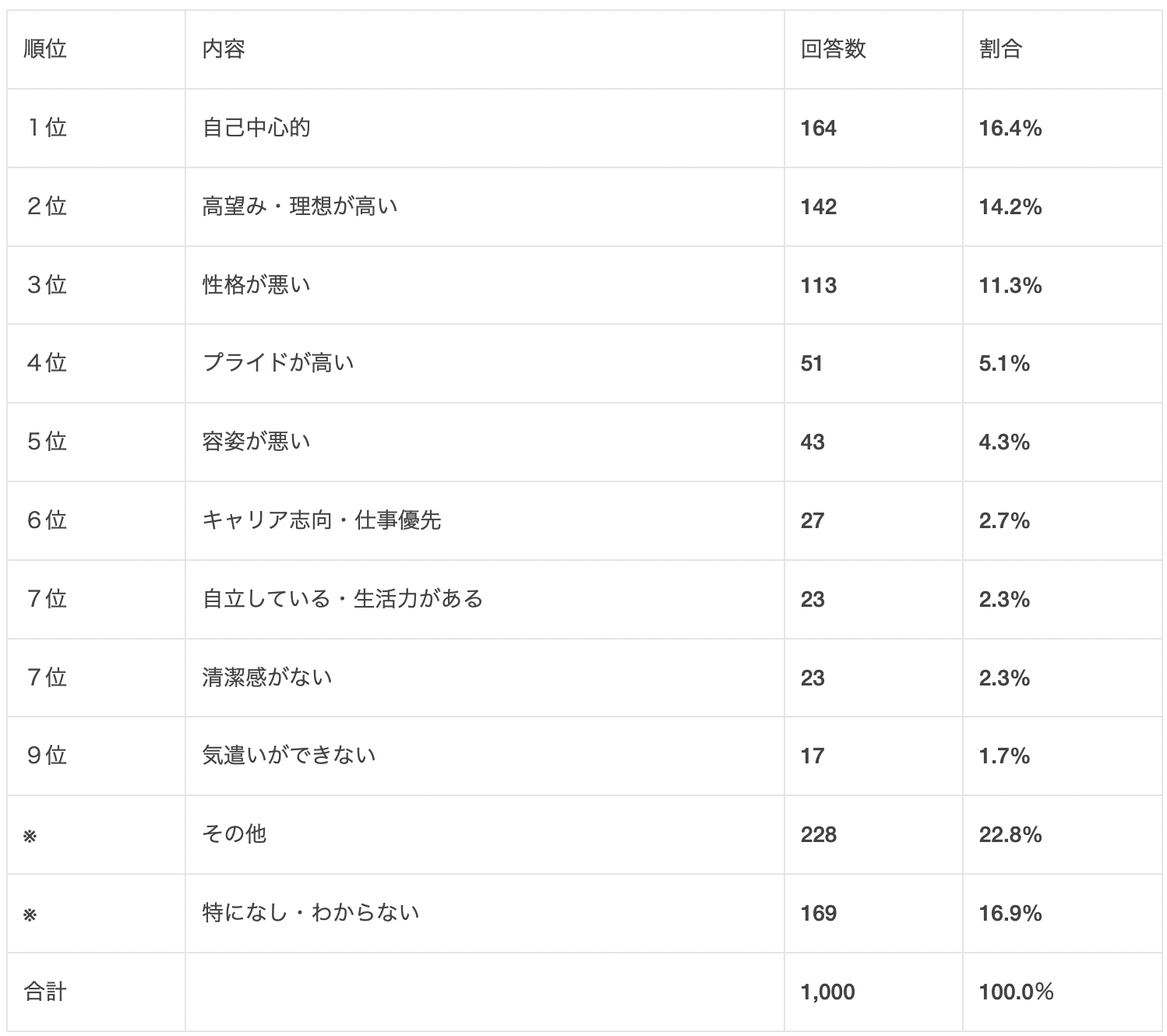 1位が「自己中心的」で16.4%、続いて2位「高望み・理想が高い」14.2%・3位「性格が悪い」11.3%でした。