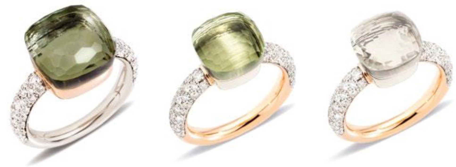 リング「ヌード」:(左から)K18RG×K18WG×プラシオライト 407,000円、K18RG×K18WG×プラシオライト×ダイヤモンド 638,000円(税込)