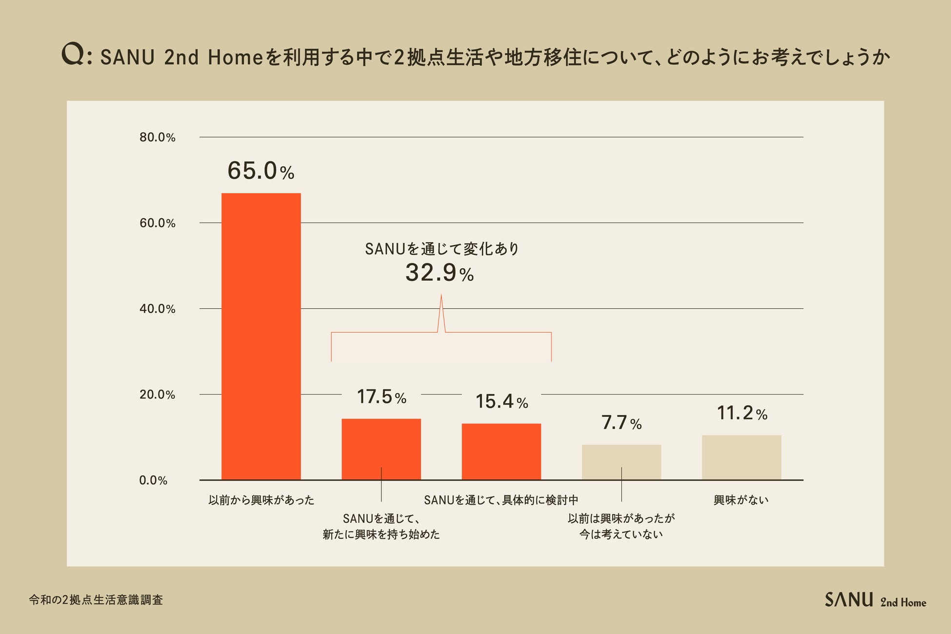政府や自治体は「地方移住」や「2拠点生活」の推進を図っていますが、今回の調査では「関心」と「実行」の間にある大きなハードルが改めて浮き彫りになりました。本調査では、「なぜ動けないのか」「どうすれば行動につながるのか」を明らかにするとともに、当社が展開するシェア別荘サービス「SANU 2nd Home」のユーザーアンケートも照合し、“令和の2拠点”のあり方を探りました。