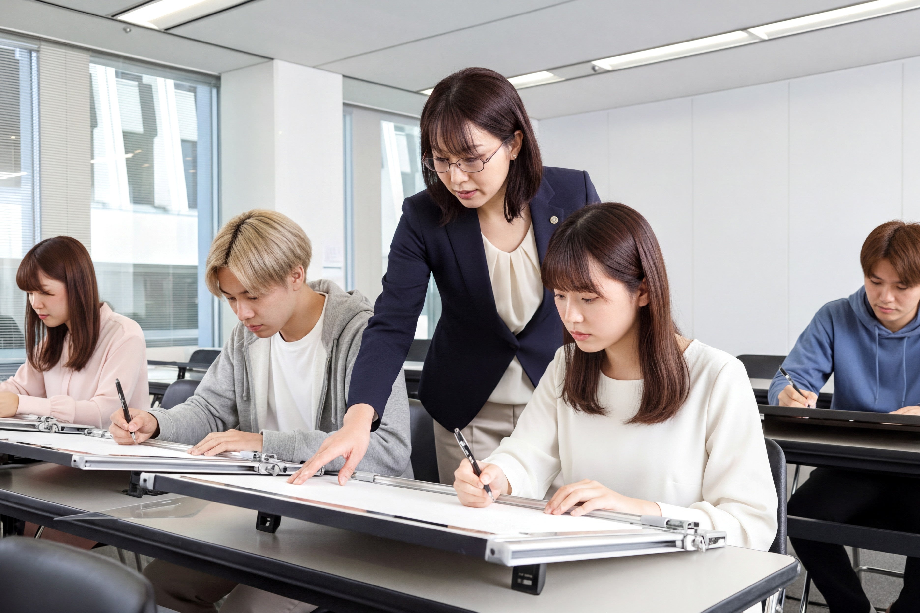 作図手順の指導を段階ごとに行い、作図途中の手元は講師が教室を巡回し確認します。