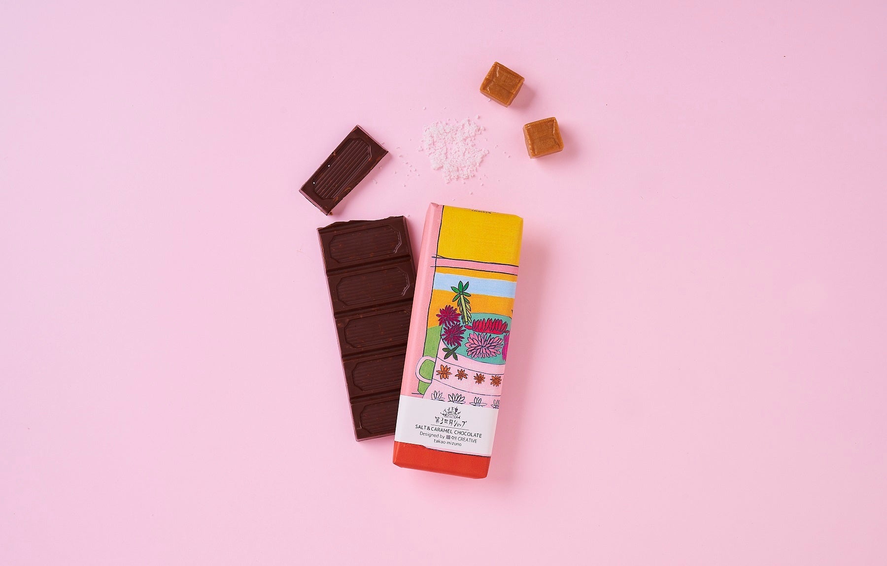 くちどけなめらかなヴィーガンミルクチョコに、シーソルトとカルメ焼きをブレンド。甘さと塩味のバランスが絶妙。