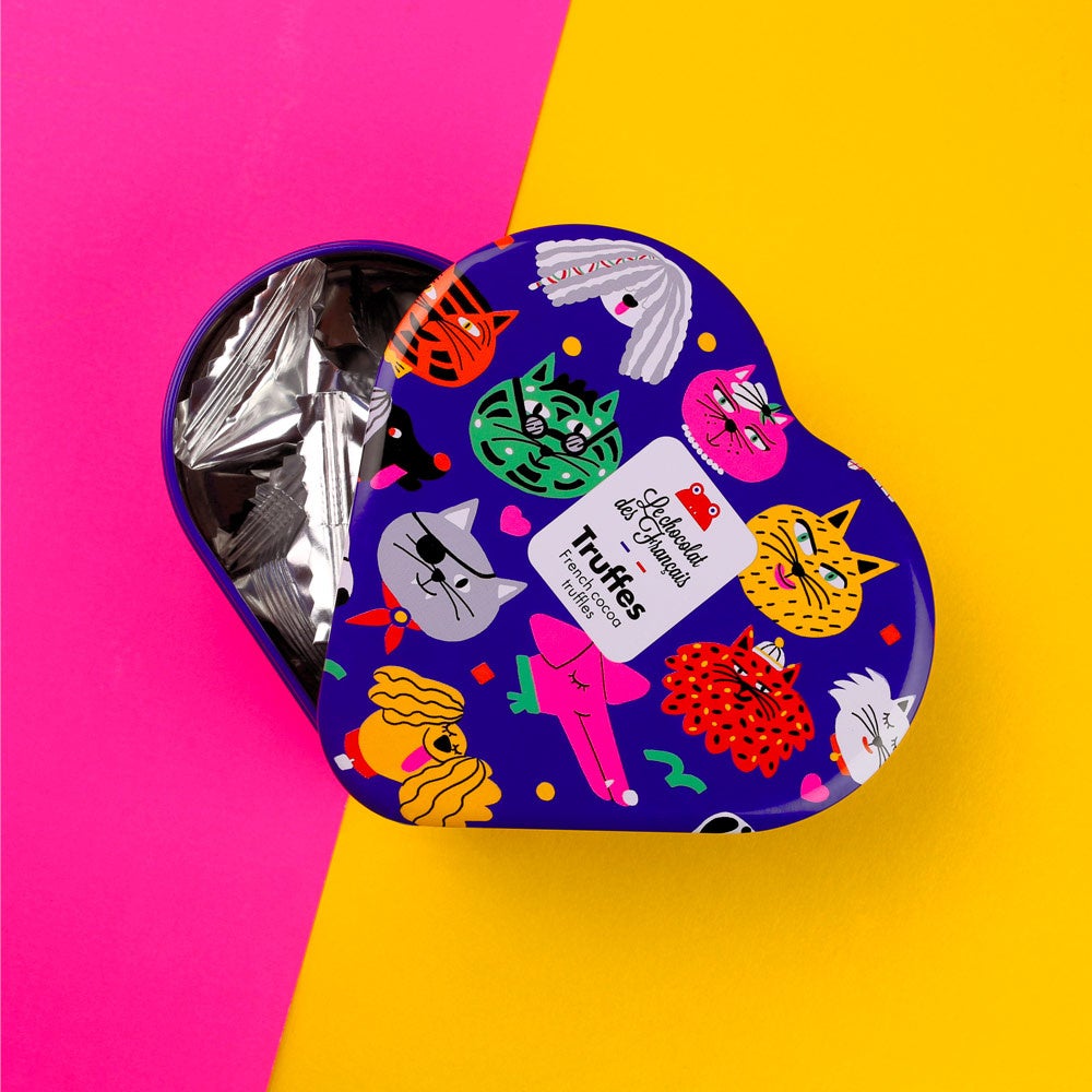 キュートなハート缶に口どけなめらかな、ほろ苦いダークトリュフチョコレートを詰めました。