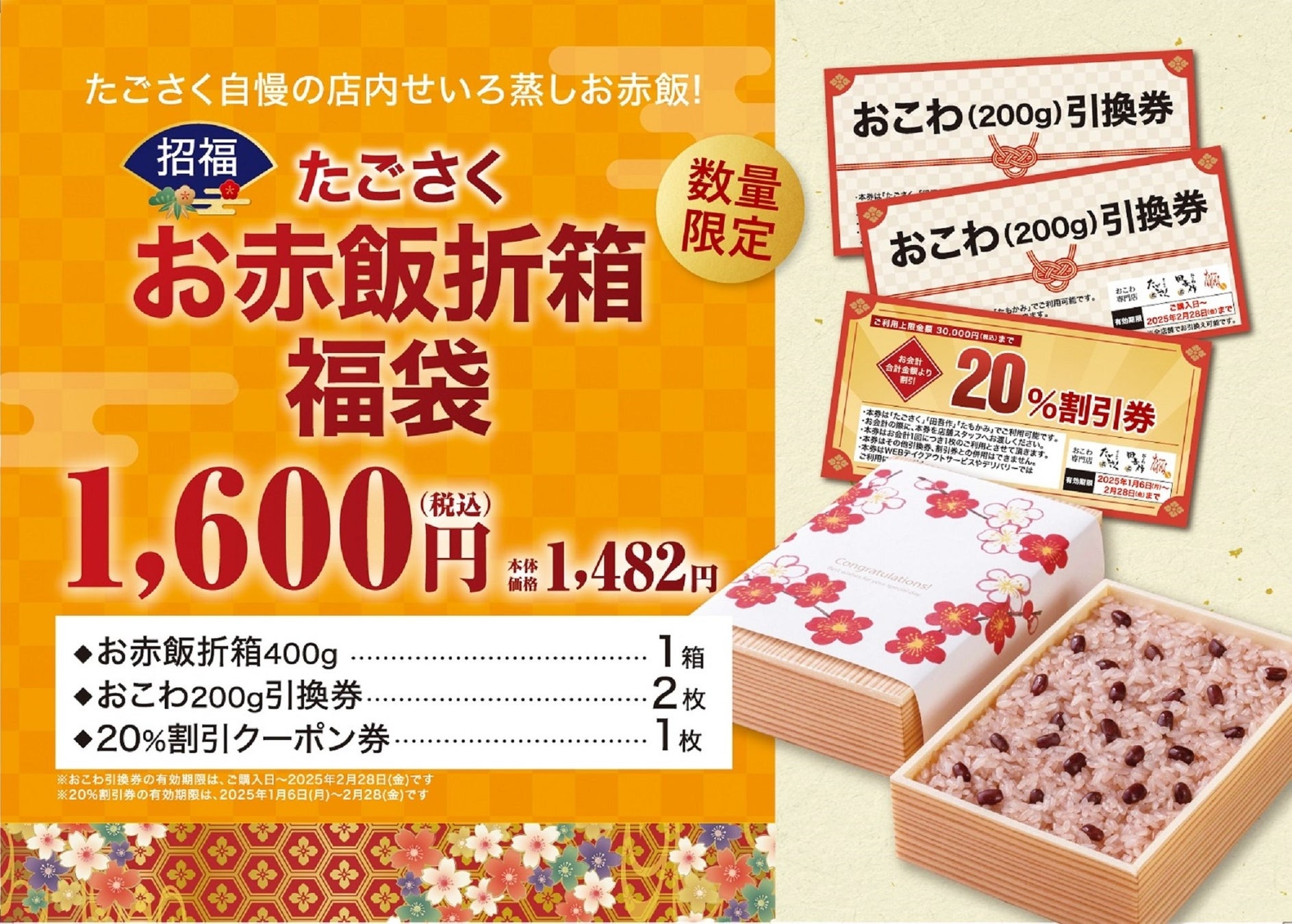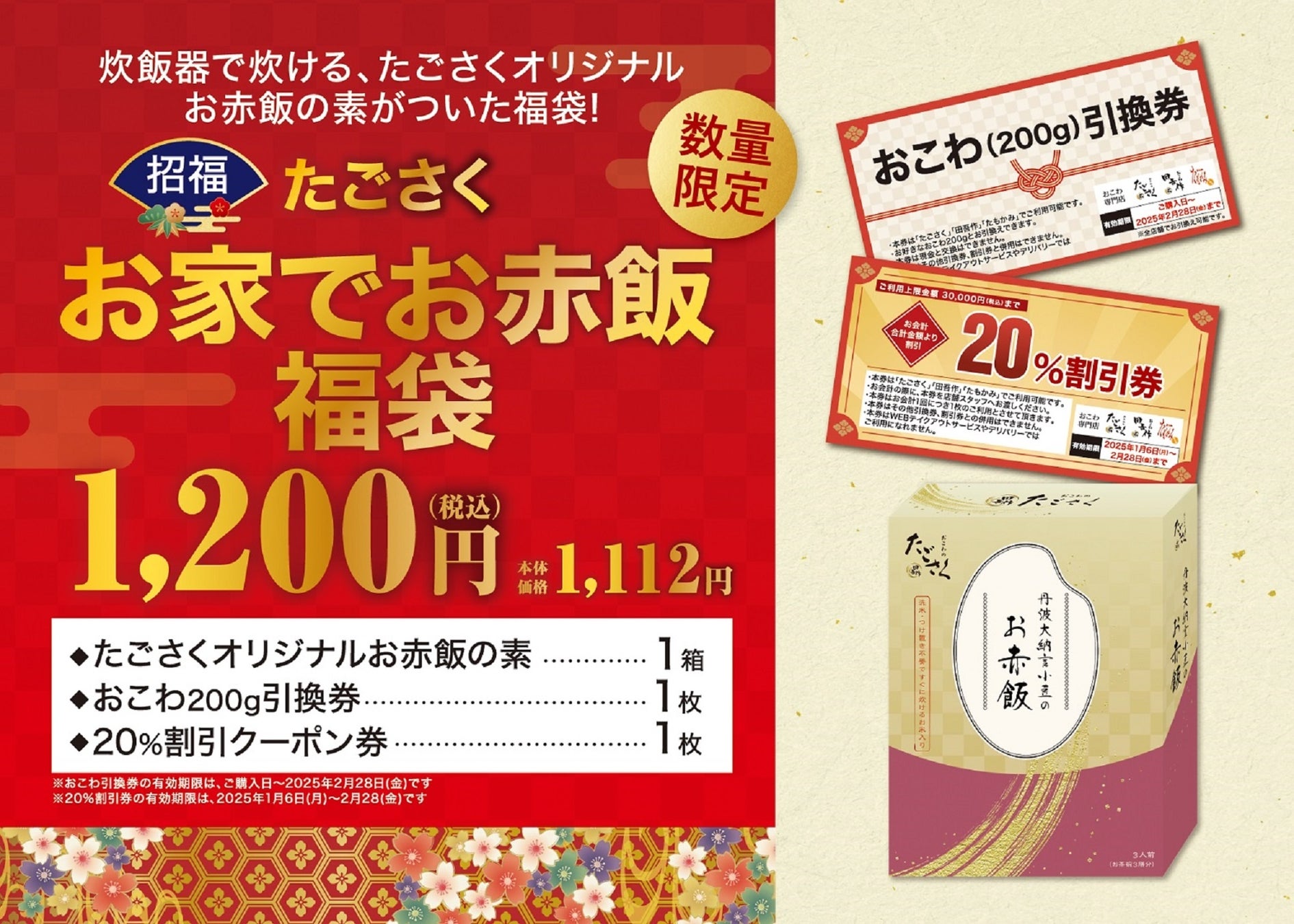 株式会社グリーンハウスフーズが展開するおこわ専門店「たごさく」「たもかみ」では、日ごろの感謝の気持ちを込め、全国の店舗にて、初登場の「お家でお赤飯 福袋」をはじめとした、お得な福袋2種を2025年1月1日(水)より数量限定販売いたします。