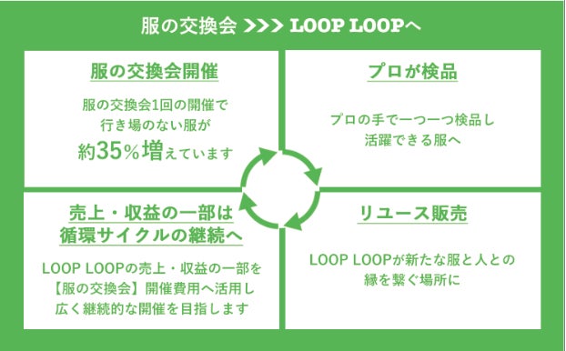 また、弊社においてもクローズしたブランドの販売できない商品や、商品開発におけるサンプル品など、着用いただくうえで問題のない服が発生する課題を抱えていました。それらの服に新たな生命を吹き込み必要な方にお届けし、セカンドハンドのファッションを楽しんでいただく循環サイクルを拡大すべく『LOOP LOOP(ループループ)』をフリマアプリ「メルカリ」にてオープンします。