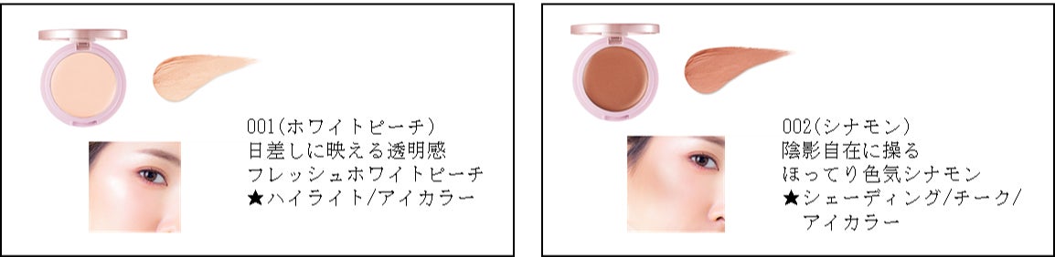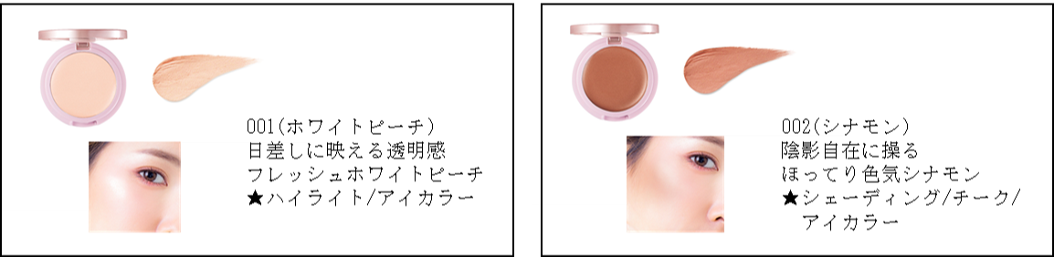 とろっととろけて、さらっとのびる。濡れたようなツヤを仕込むハイライト&アイカラー。内側からツヤめき、立体感を演出。日差しに映える透明感、フレッシュホワイトピーチ。2.0g