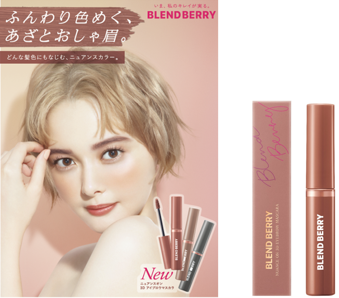 2021年9月に発売したカラー眉を楽しむ「ニュアンスオン3Dアイブロウ」は、”ふんわり柔らか立体眉もしっかりきりっと立体眉も作れる点”が好評を博しております。このような背景から、今回同シリーズより、『BLEND BERRY』のセオリーである“スキンハーモナイジングカラー”をプラスし、どんな髪色・眉にもなじむアイブロウマスカラを発売します。