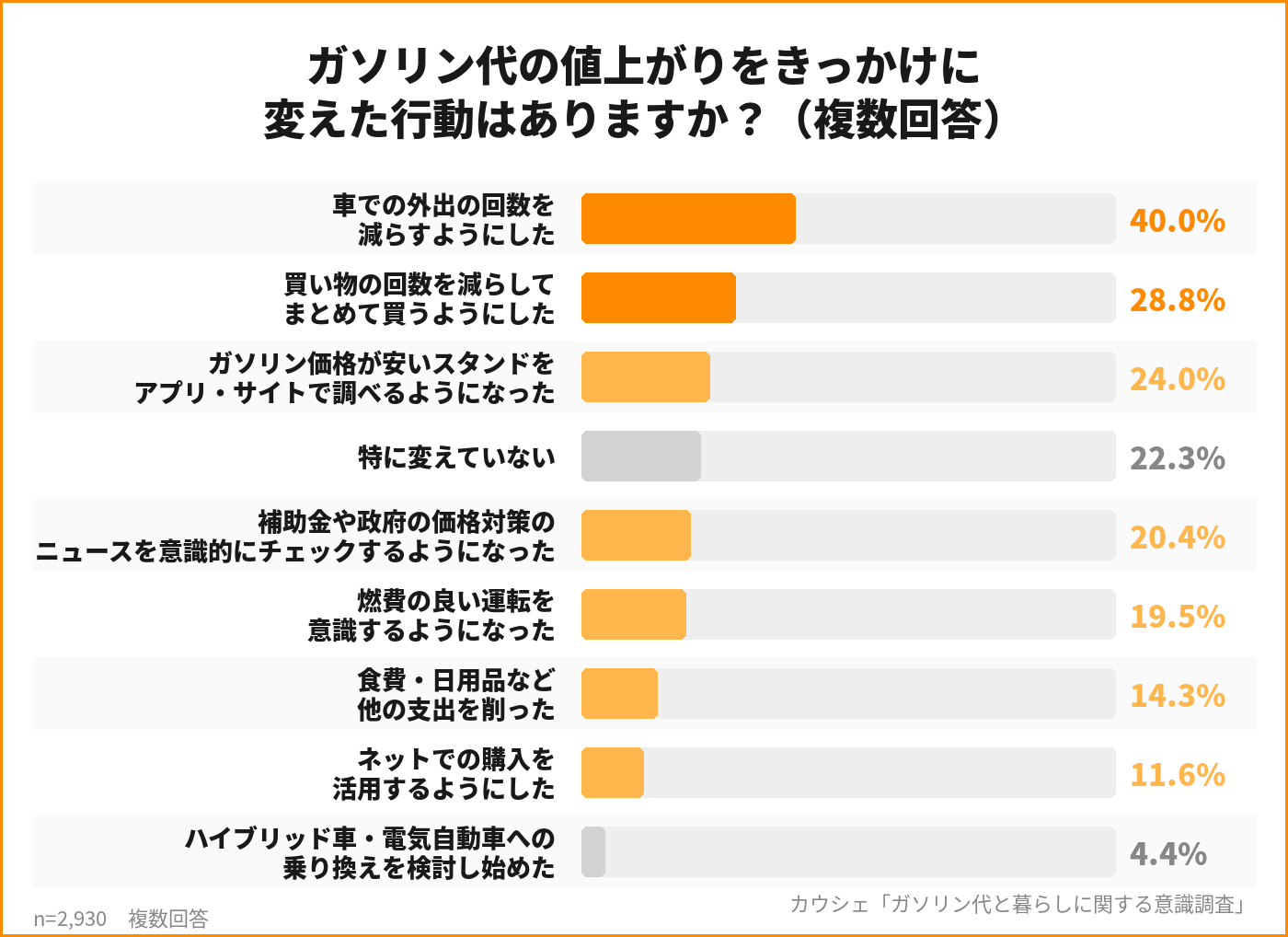 行動変化1位は「車での外出を減らした」(40%)、2位は「まとめ買いに切り替えた」(28.8%)