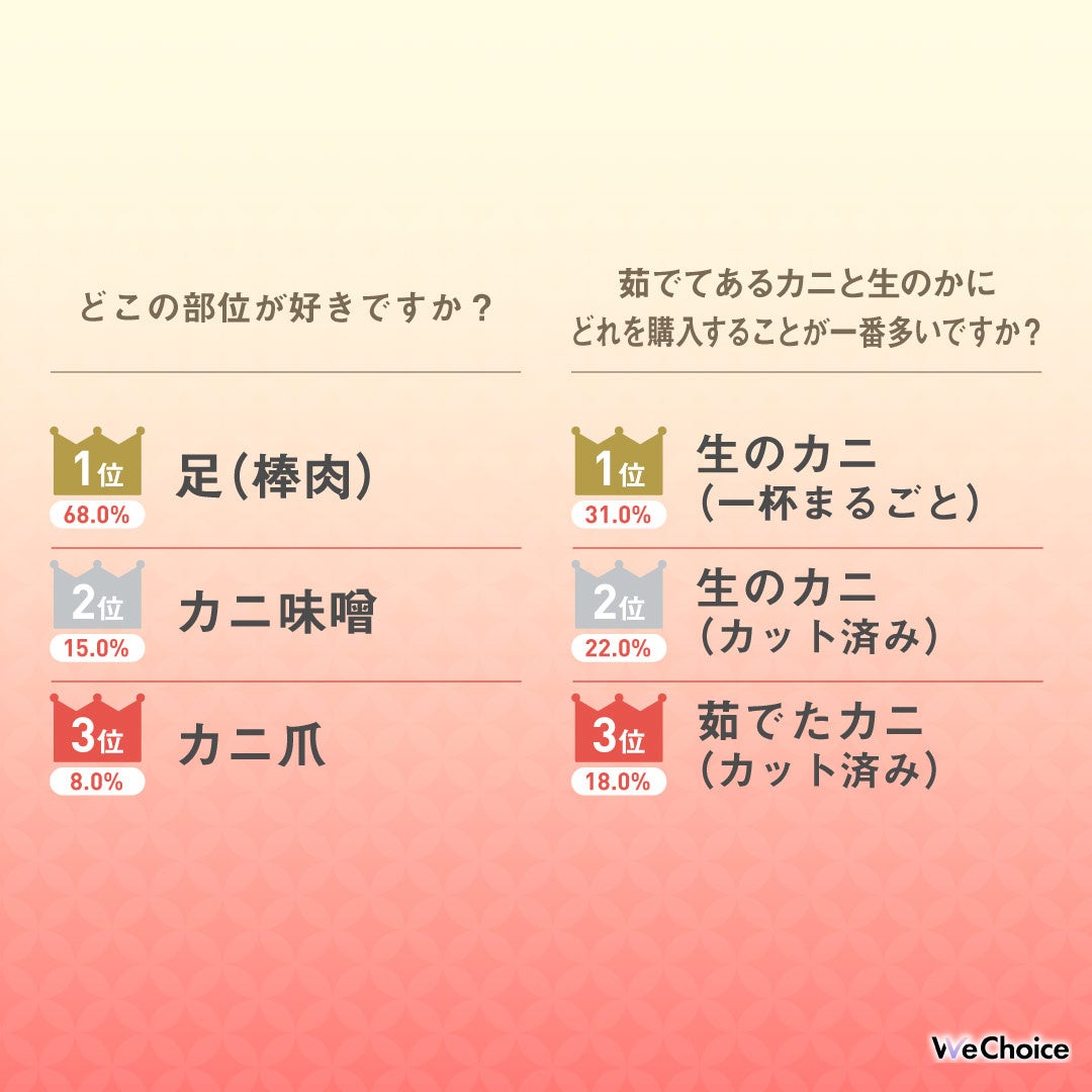また、好きな部位では棒肉部分が人気でした。2位3位でもカット済みのカニが購入されていますが、棒肉はそのまま解凍して食べることが可能なのも人気の理由の一つかもしれません!
