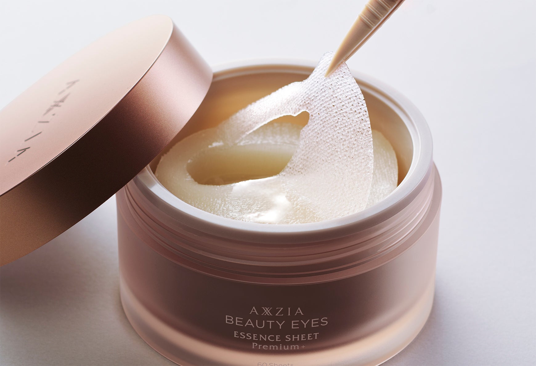大人の目もと悩み“ハリ不足”や“乾燥くすみ”は目もとに影を落とし、暗い印象を与えがちです。「エッセンスシート プレミアム プラス」は、そんな目もとに、「トリプルミネラルコンプレックス*²」に加えて、ビタミンKを含んだ複数のオイルを新配合しました。まぶた~目尻~目の下~頬の三角ゾーンまで、目まわり全体を覆うアクシージアオリジナル形状はそのままに、美容液をたっぷり90mLに増量。アイシートにしかないみずみずしさを肌の奥まで届け*³、目まわりの徹底エイジングケア*⁴を叶えます。