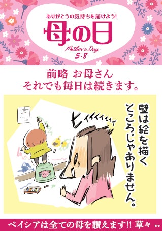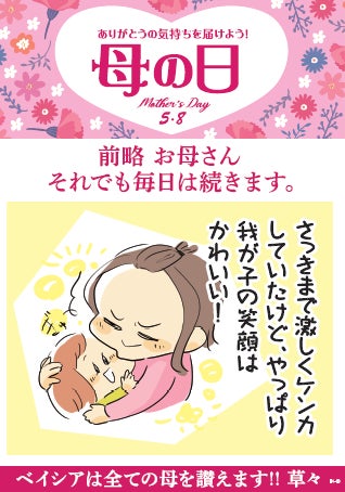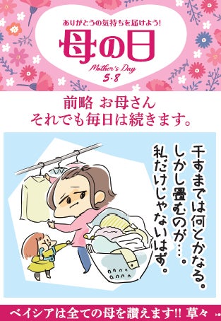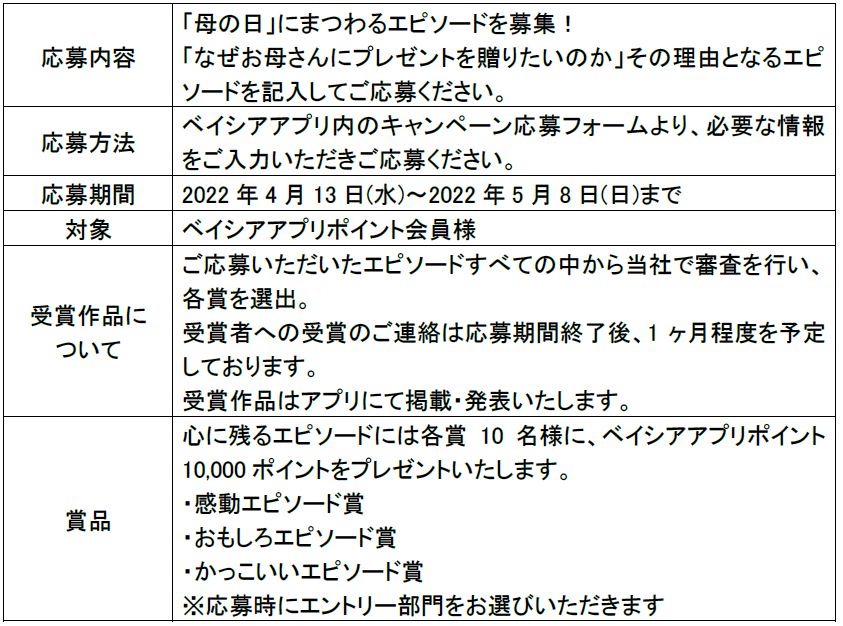 株式会社ベイシア(本社:群馬県前橋市、代表取締役社長:橋本浩英)は、4月13日(水)~5月8日(日)の期間で、「あなたは母に何を捧げますか?」と題して、お母さんにまつわるエピソードをベイシアアプリ内で募集いたします。「なぜお母さんにプレゼントを贈りたいのか?」その理由となるエピソードをご応募いただきます。ご応募いただいたエピソードの中から心に残るエピソード各賞を選出し、賞品としてベイシアアプリポイントをプレゼントいたします。また店内各所では家族の日常の一コマをイラストでご紹介し、母の日を盛り上げます。ぜひ今年の母の日はベイシアと一緒にお母さんに感謝の想いを伝えてみませんか。