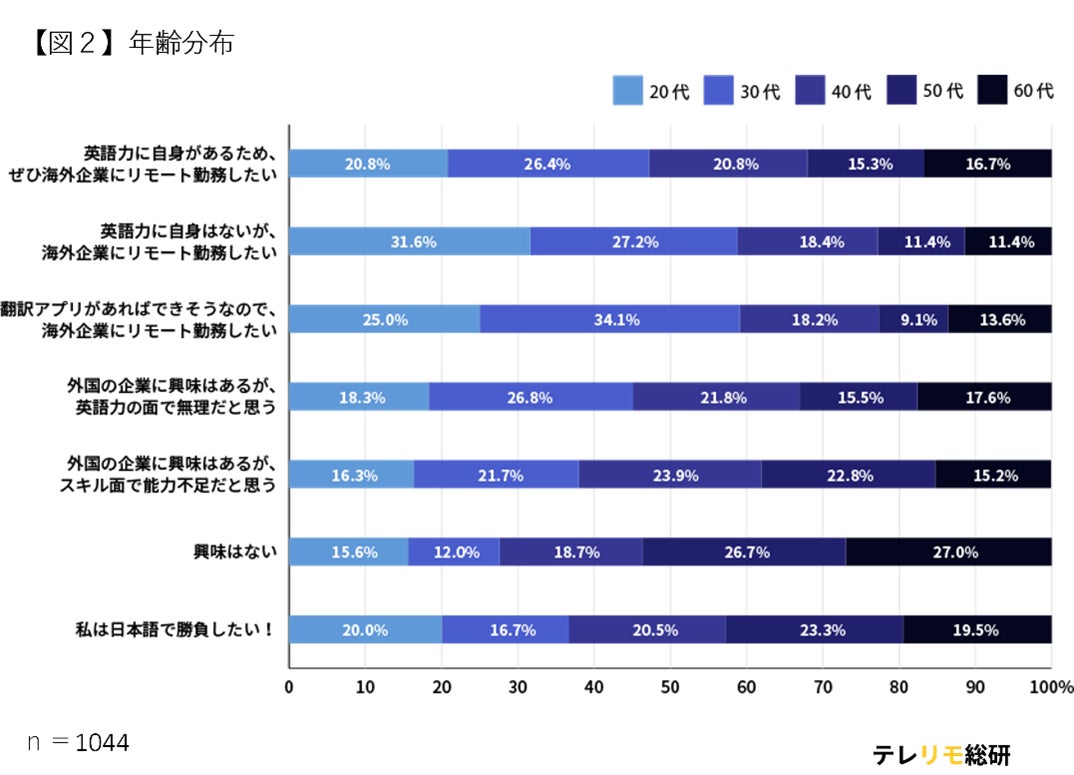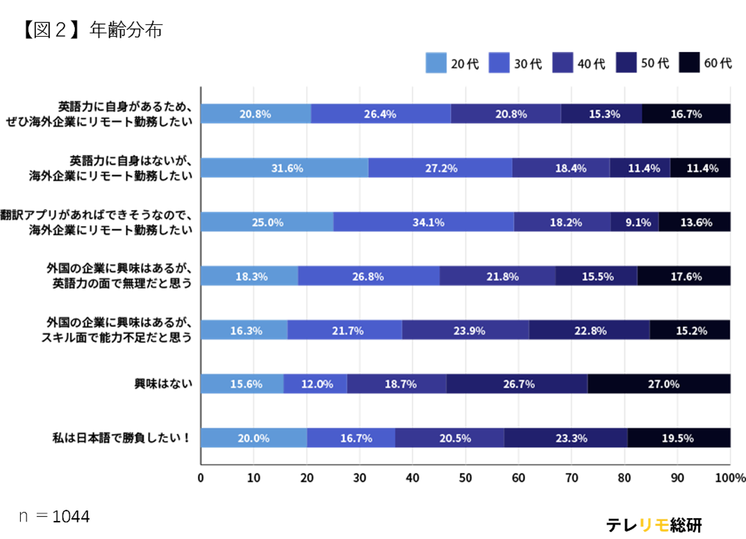 年代別で見てみると、「勤務したい」と回答した26.2%は、20代から30代の若手が多い傾向にあります。反対に「興味なし」「日本語で勝負したい」と回答した51.3%は、40代以降のシニア層が多い傾向にあるようです。