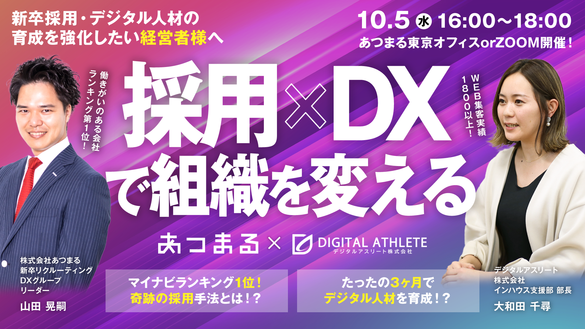 究極のノウハウを持つデジタルアスリート 2社共催で【奇跡の新卒採用×DX人材の育成で組織を変える!】と題し、 特別セミナーを開催いたします!