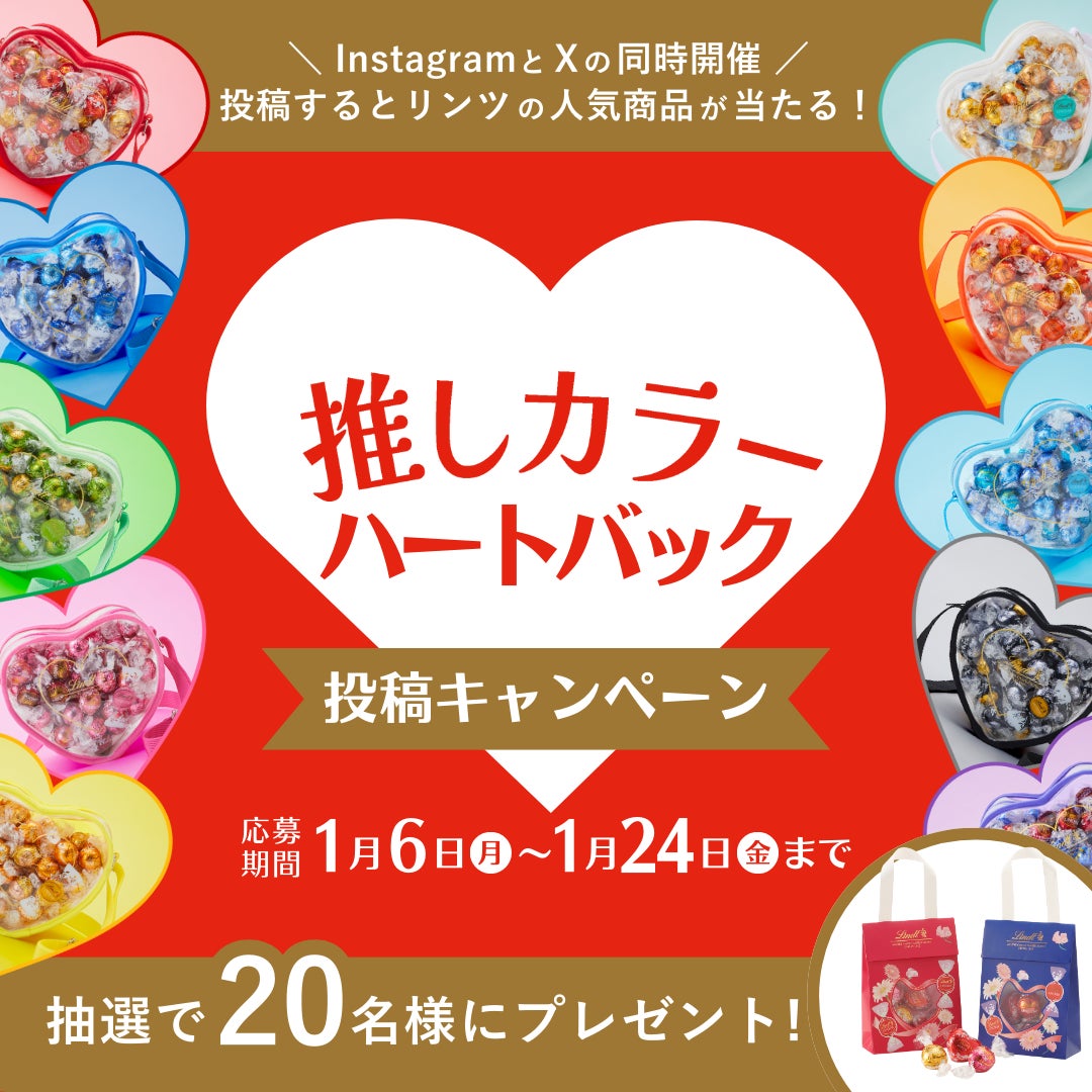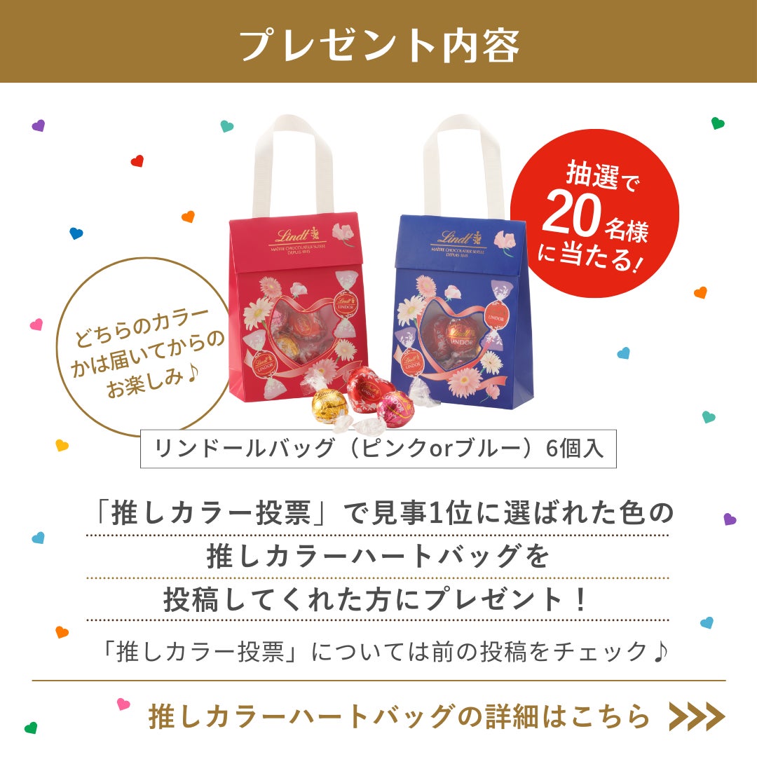 推しカラーハートバッグをご購入いただき、「#リンツ推しカラーハートバッグ」を付けてインスタグラム、Xに投稿いただいた方の中から、抽選で20名様に、リンドール バッグ 6個入(ブルーまたはピンクいずれか1つ)をプレゼント。