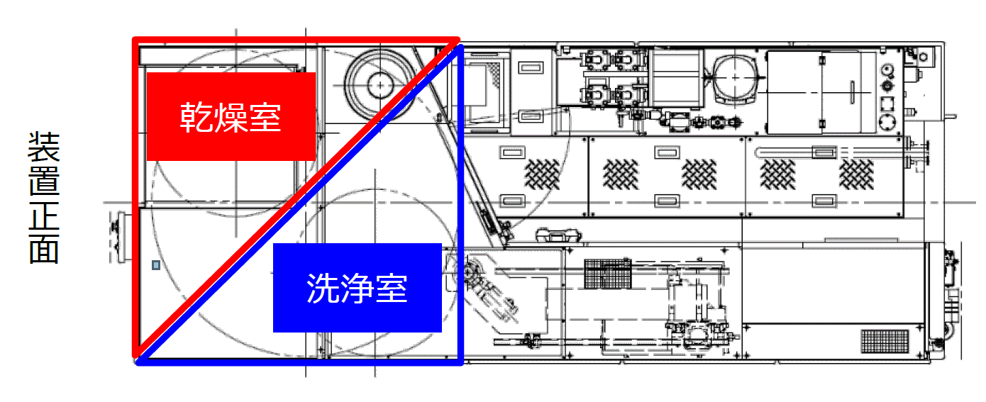 (4)大型EV部品の洗浄が可能な広い洗浄エリアと、省スペースなフットプリントを両立