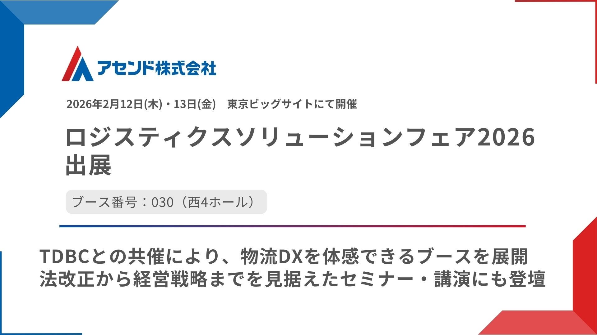 物流DXを推進するアセンド株式会社(本社:東京都新宿区、代表取締役:日下瑞貴、以下「当社」)は、2月12日(木)・13日(金)に東京ビッグサイトで開催される「ロジスティクスソリューションフェア2026」に出展いたします。「ロジスティクスソリューションフェア」は、持続可能な物流・ロジスティクスの実現に向けて、DX・GX・人材戦略の最新事例と知見を共有する展示会です。