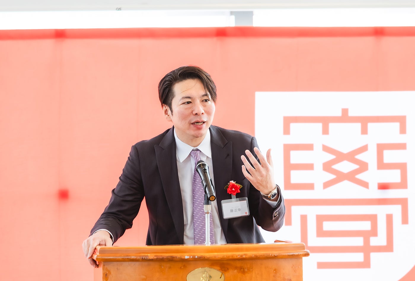 式典では土橋直樹学部長からの式辞のほか、運営母体である株式会社エスアイイーの藤正幸社長からの祝辞、提携するエセックス大学のアネシー・ラックス博士からのビデオメッセージを上映しました。