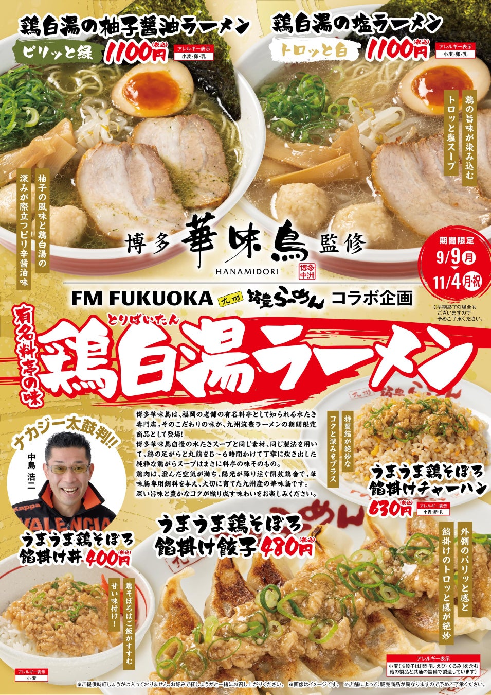 【エフエム福岡×九州筑豊ラーメン】今年は”鶏”が主役!?老舗料亭「博多華味鳥」監修、大人気MC中島浩二さんも太鼓判の「鶏白湯ラーメン」2品(柚子・塩)とサイドメニュー3品を9月9日より秋季限定販売!