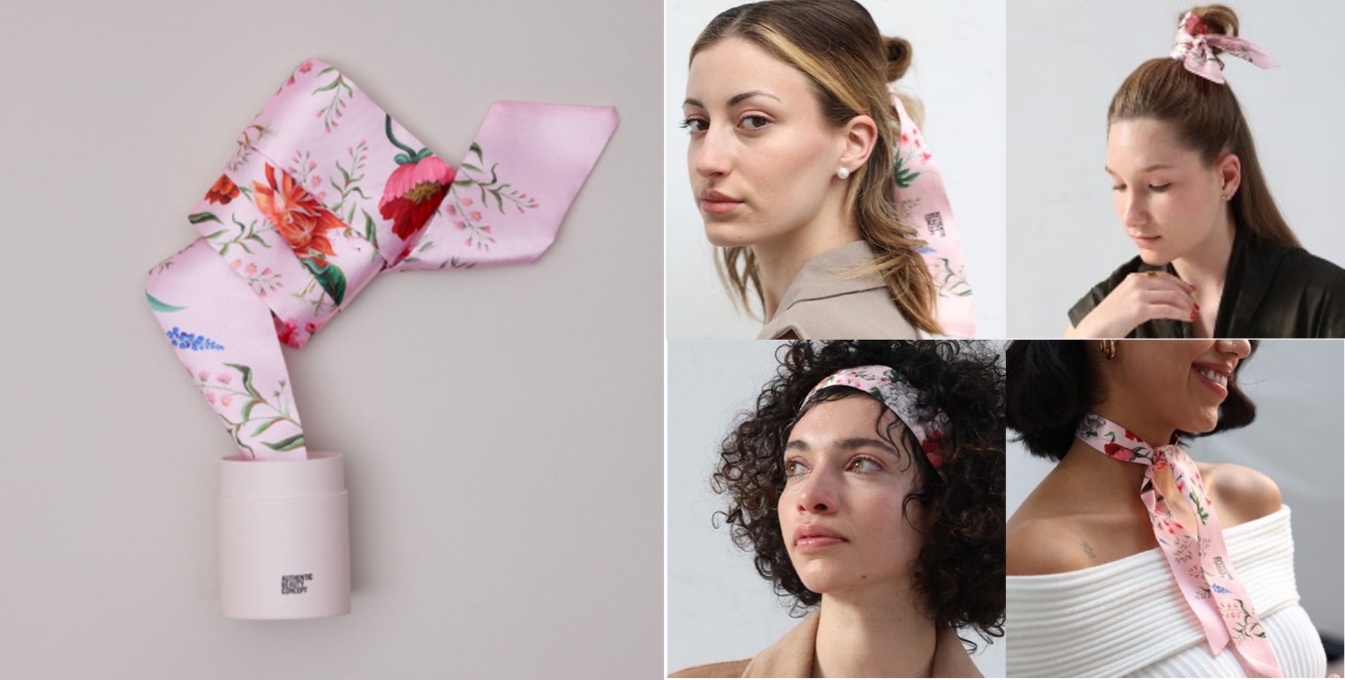 ボタニカルな小花をあしらったラグジュアリーなリボンスカーフは、イギリス出身のモデルでファッショニスタとしても人気が高いSuki Waterhouse(スキ・ウォーターハウス)がデザインを監修。