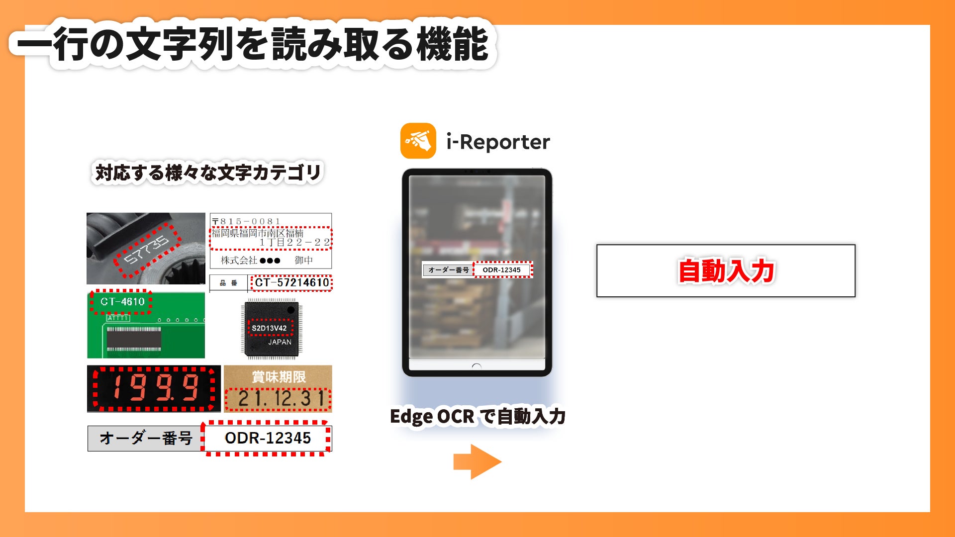 ・品名、品番、ロット番号など日本語、英語、数字や記号を読み取りたい