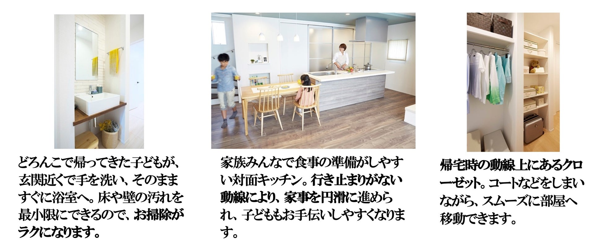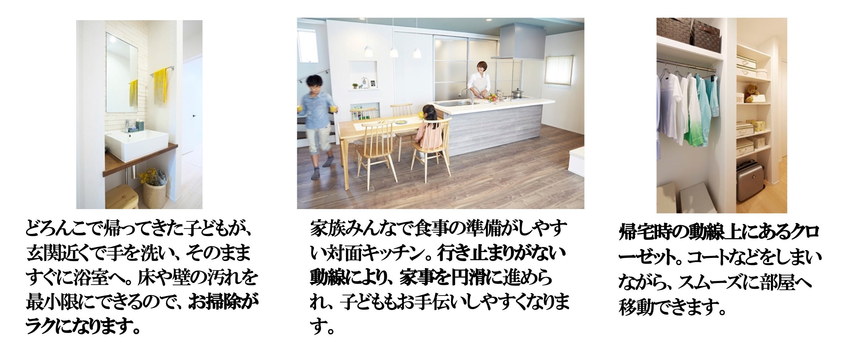 特に「FAVO for DAYS」では、どろんこで帰宅した子どもの動線、家族全員での食事の準備動線。帰宅時動線などの家族全員の生活動線を想定した間取りを提案しています。