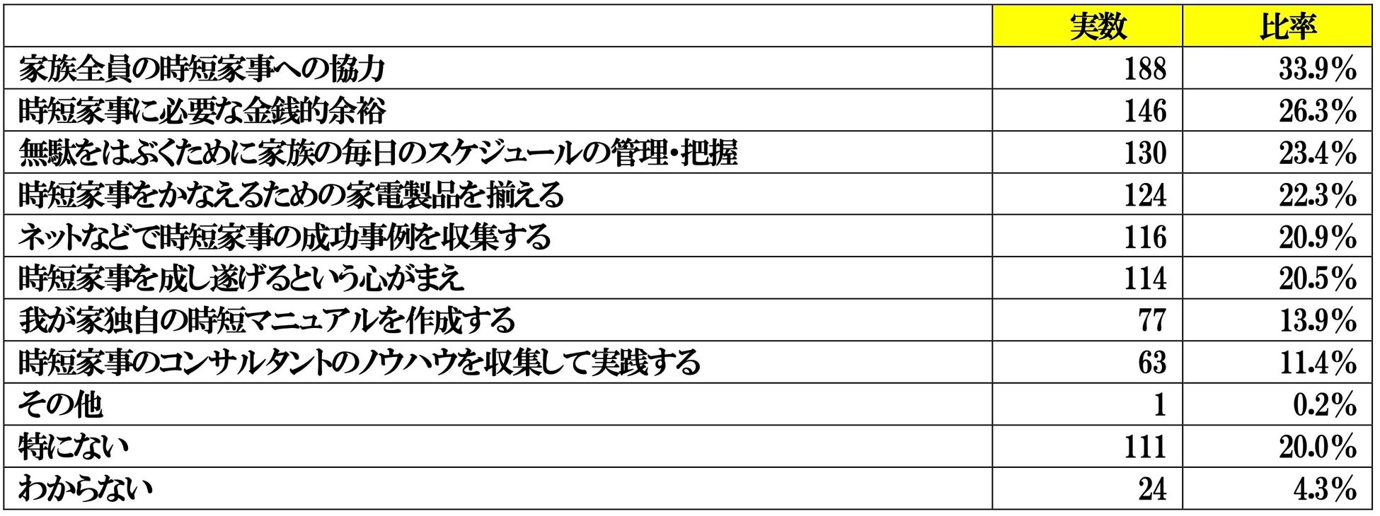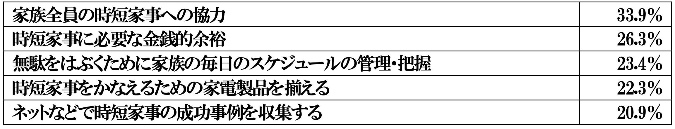 時短家事を成功させるためには、やはり「家族全員の時短家事への協力」が最も多く33.9%。続いて「時短家事に必要な金銭的余裕」が26.3%となり、ある程度の家計の出費もやむを得ないと思っていることが伺えました。また「無駄を省くためには家族のスケジュール管理も必要」が23.4%、「時短家事のため家電製品を揃える」が22.3%となっています。時短家事については、ネット上などで多くのノウハウが紹介されています。それらを参考にするとともに、自宅の状況に合わせて、カスタマイズすることも成功の秘訣と思います。