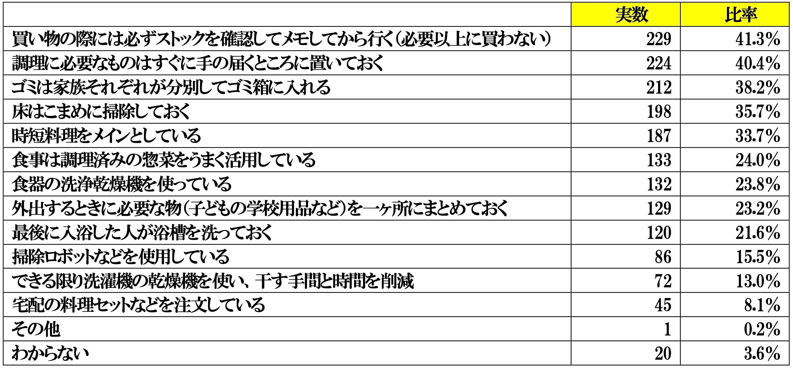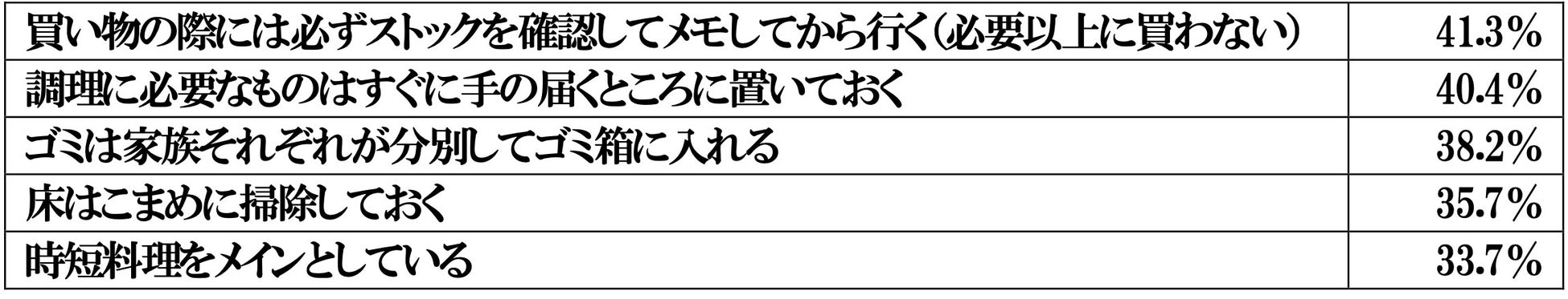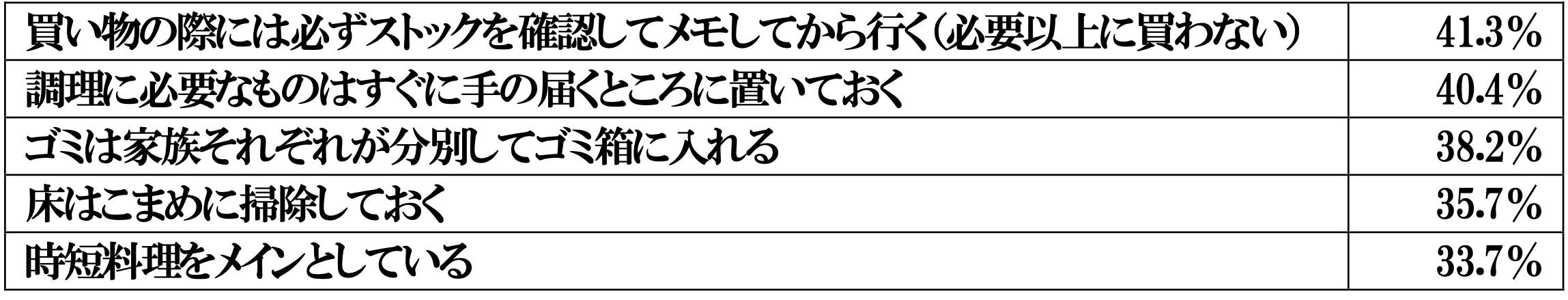 実際に取り組んでいる時短家事では、「買い物時間短縮のためのストックの確認とメモ」が41.3%となり、節約にも結びつくことからか最も多くなっています。続いて調理時間の短縮のため「調理器具は手の届くところに置いておく」が40.4%、「ゴミは家族がそれぞれ分別する」が38.2%となっています。