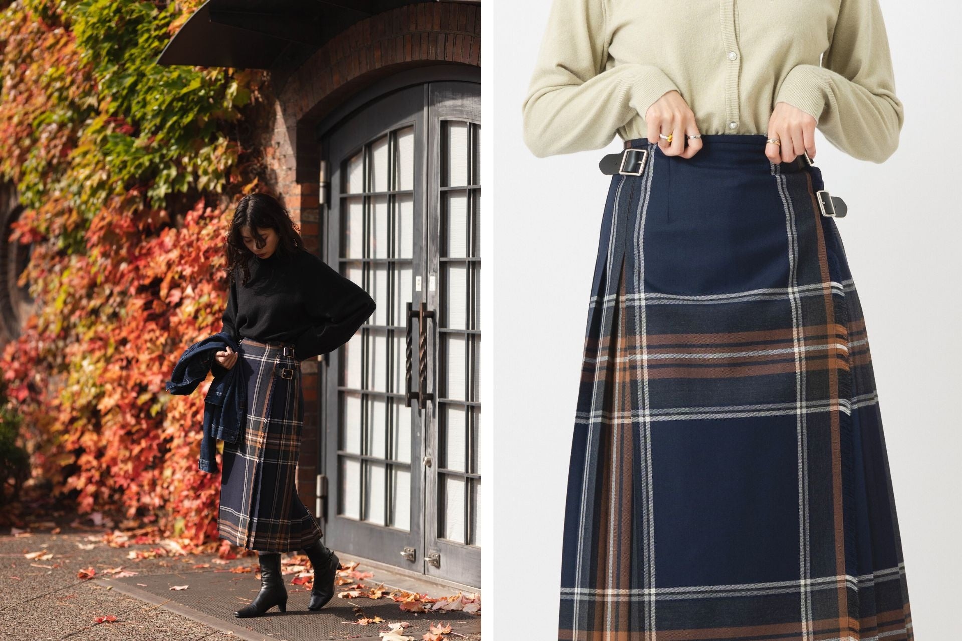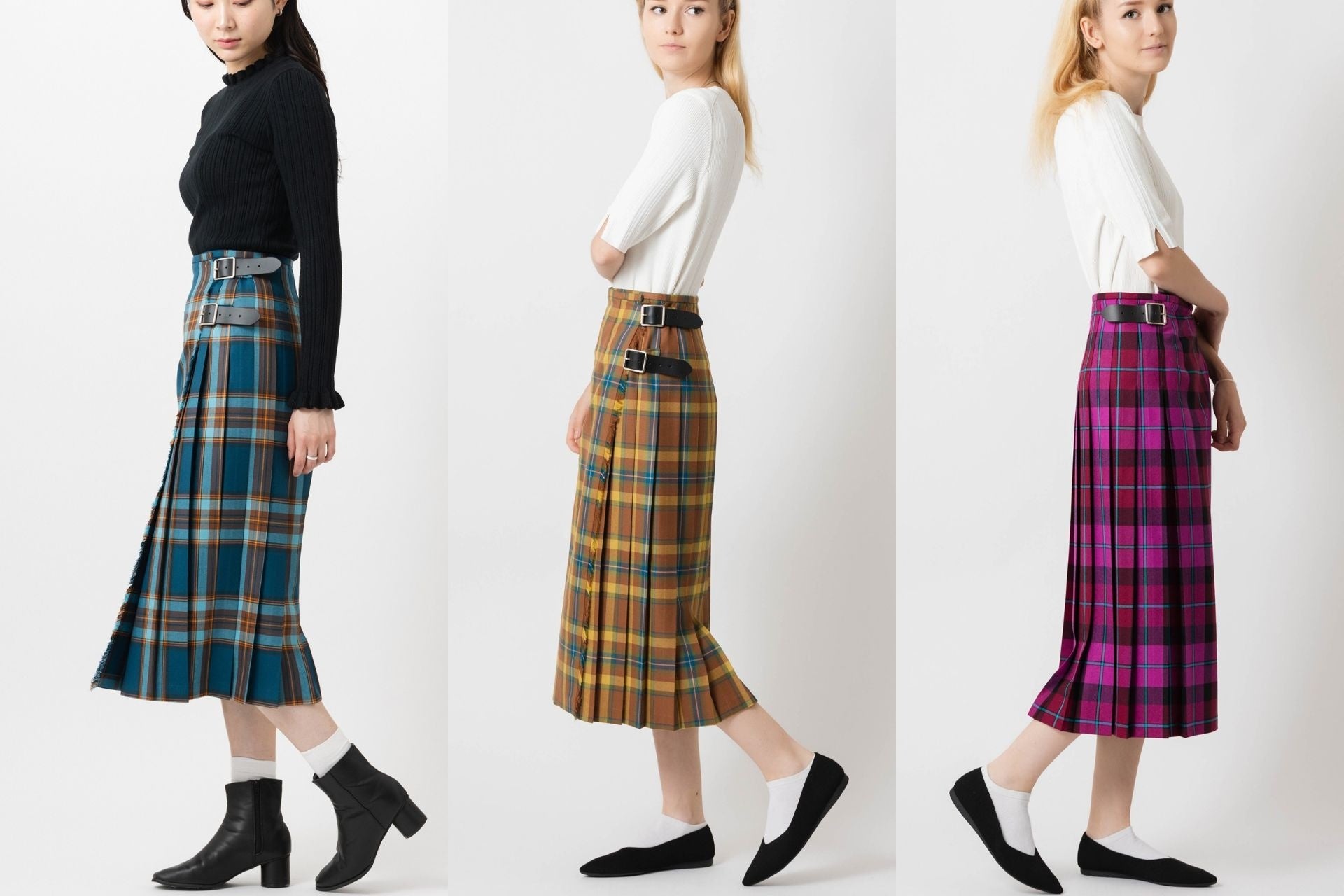ベルトで留めて着る、時代に左右されないクラシカルなキルトスカートを