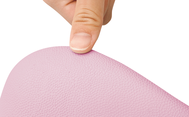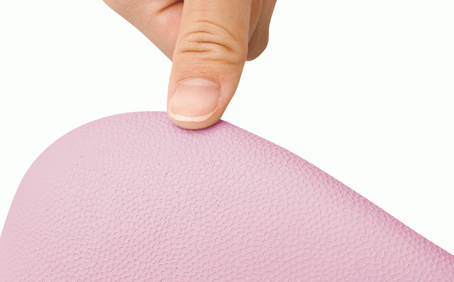 中央部が少し膨らんだ形状になっています。座ると両側から骨盤が引き寄せられると同時に、両内ももでふくらみをキュっと捕まえる意識をもつことで、内転筋の自然なトレーニングを意識付ける役割と足の広がりを抑える役割を持ちます!