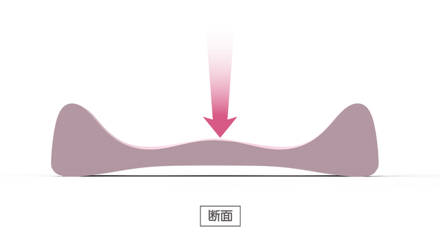 両サイドからなだらかに中央部へと傾斜していることで、座ると自然に両サイドから骨盤まわりを均等に中央へギュッと引きよせる形状になっています。