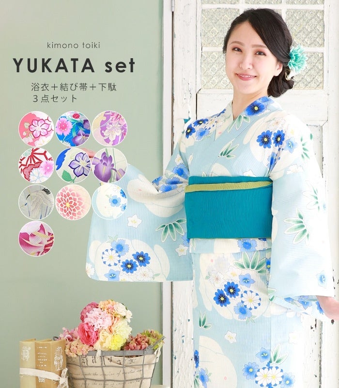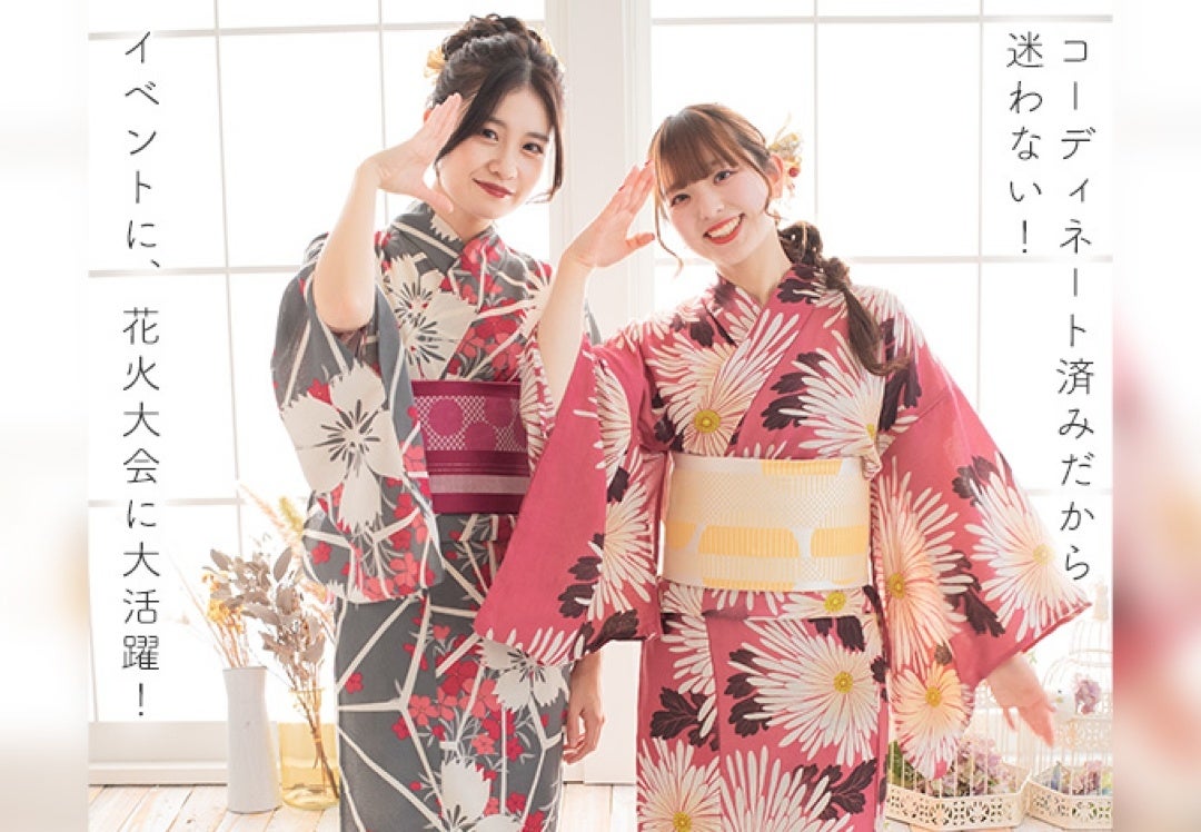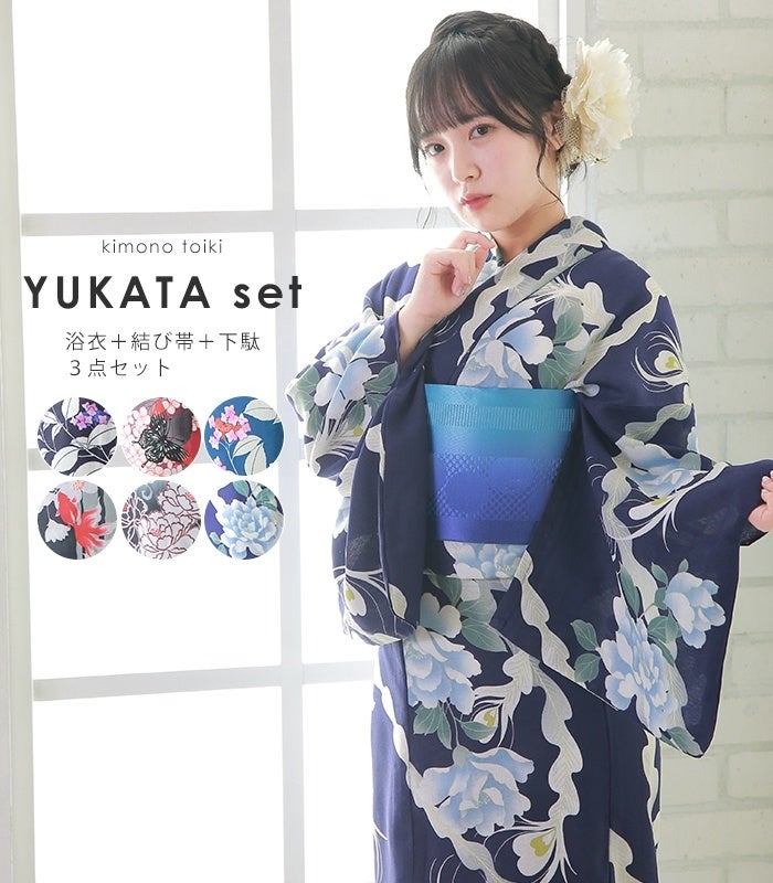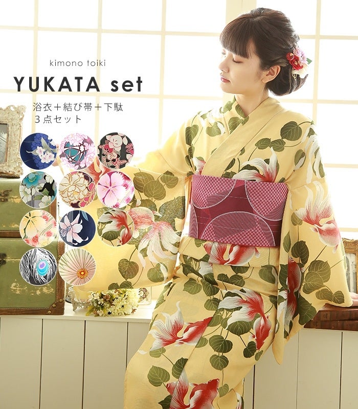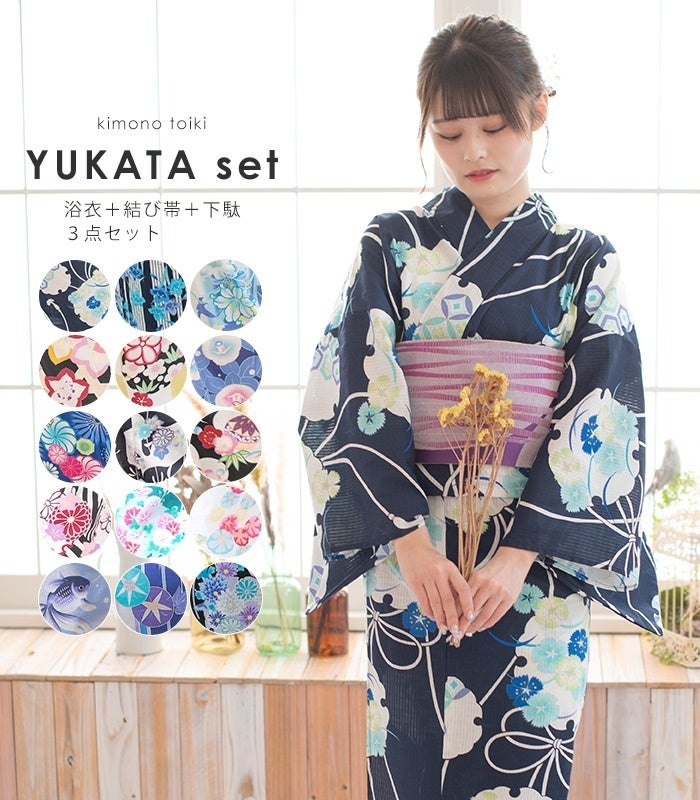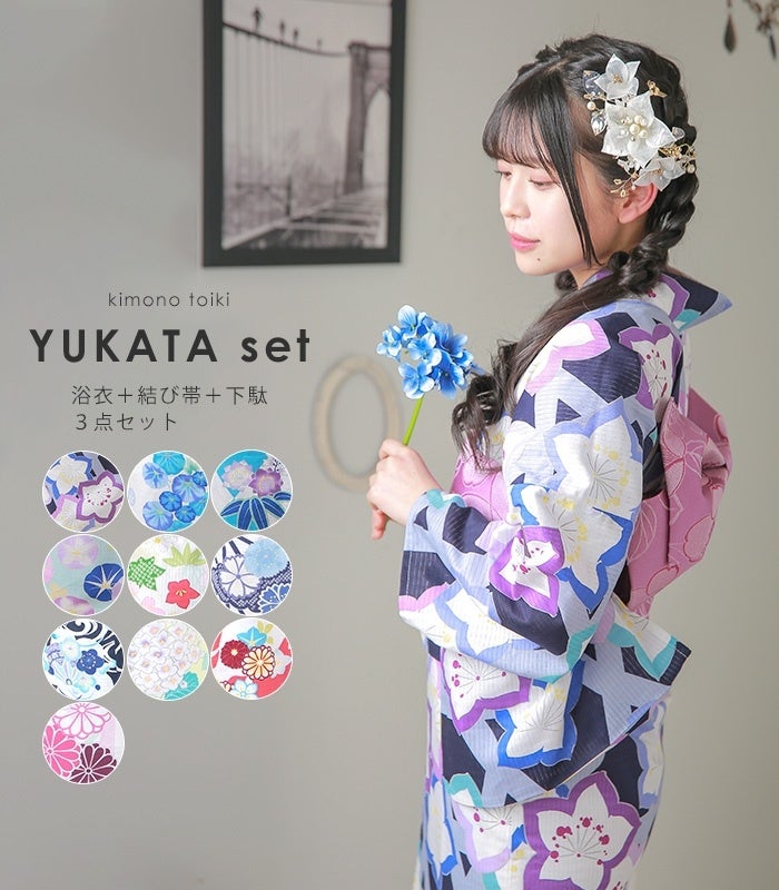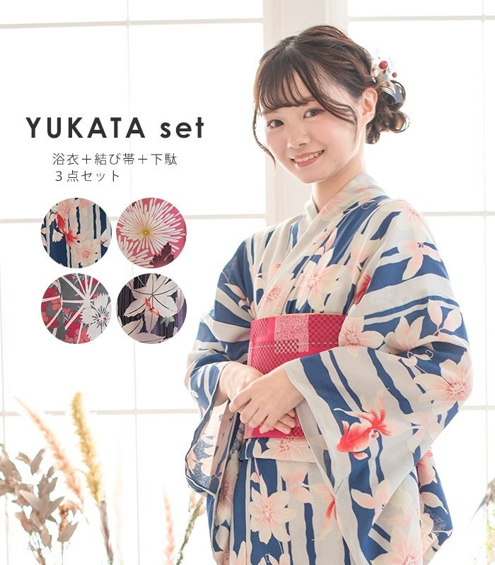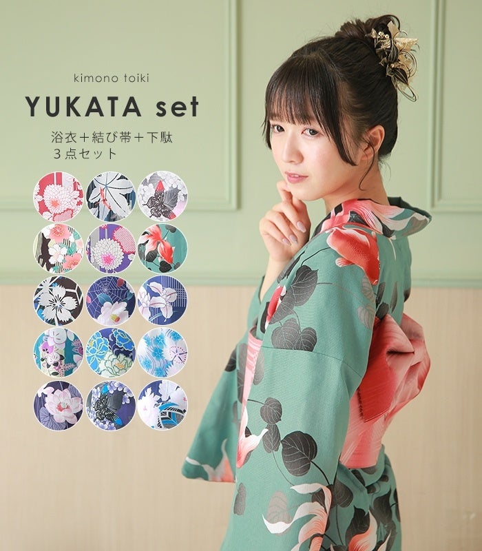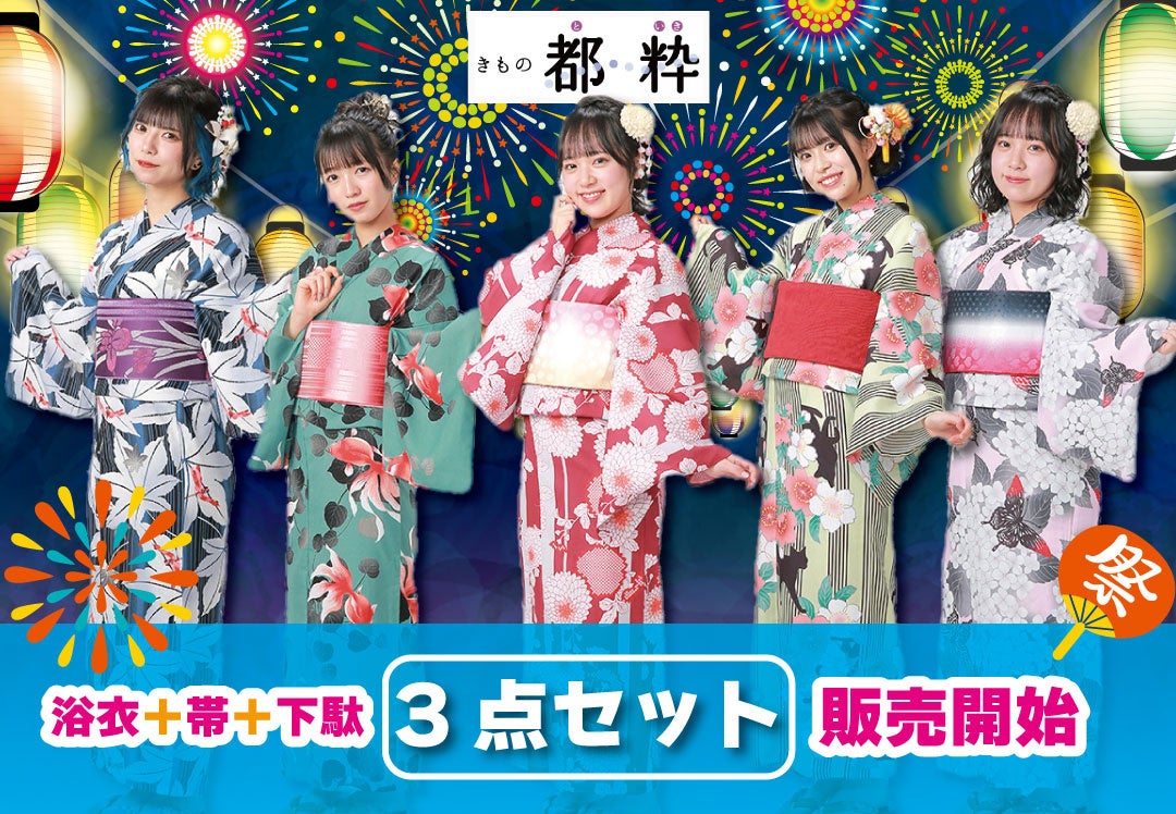カジュアル着物ショップ「きもの都粋」は、お祭りや花火大会など夏のイベントにぴったりな浴衣を、浴衣+帯+下駄の三点セットにして販売いたします。