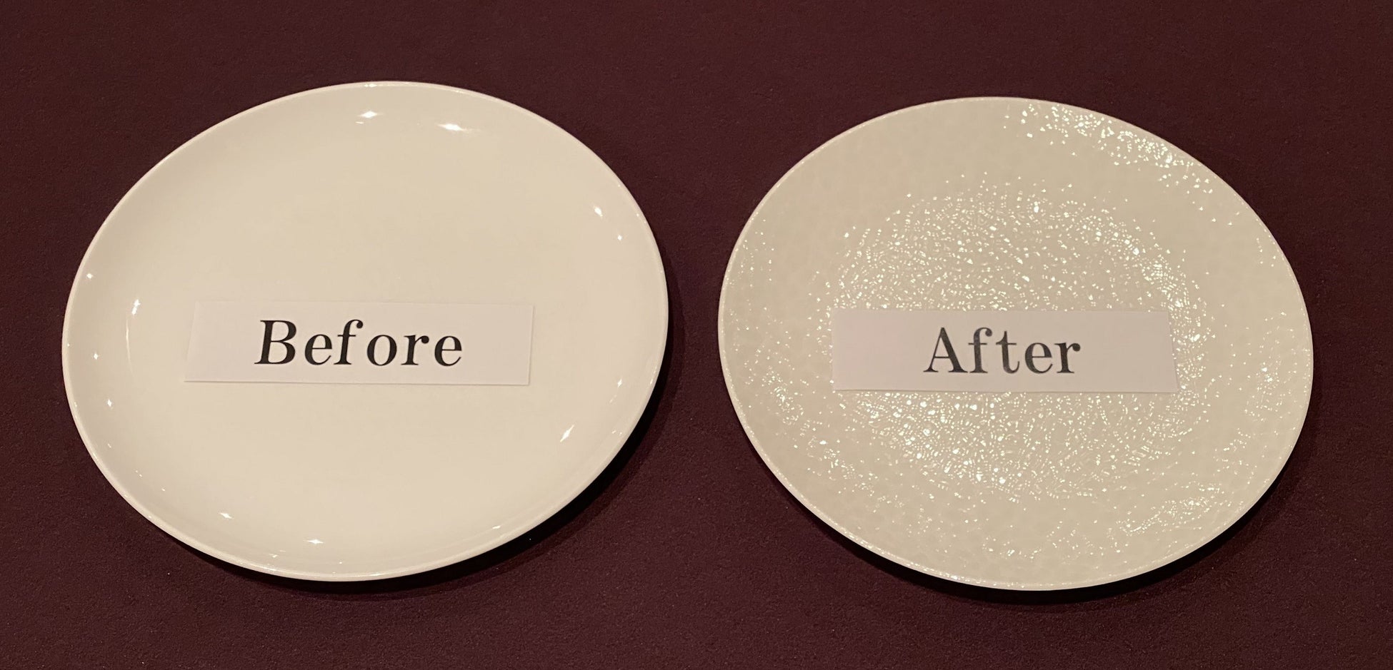 「令和4年度環境省脱炭素経営促進モデル事業」に採択された食器専門メーカーの「株式会社おぎそ」のご協力のもと、長年の使用を経て絵柄が擦れたり表面に傷がついた高価格素材の食器(ボーンチャイナ)を資源保護の観点から、新品同様に蘇らせて再度料理の取り皿として使用できるようにいたしました。