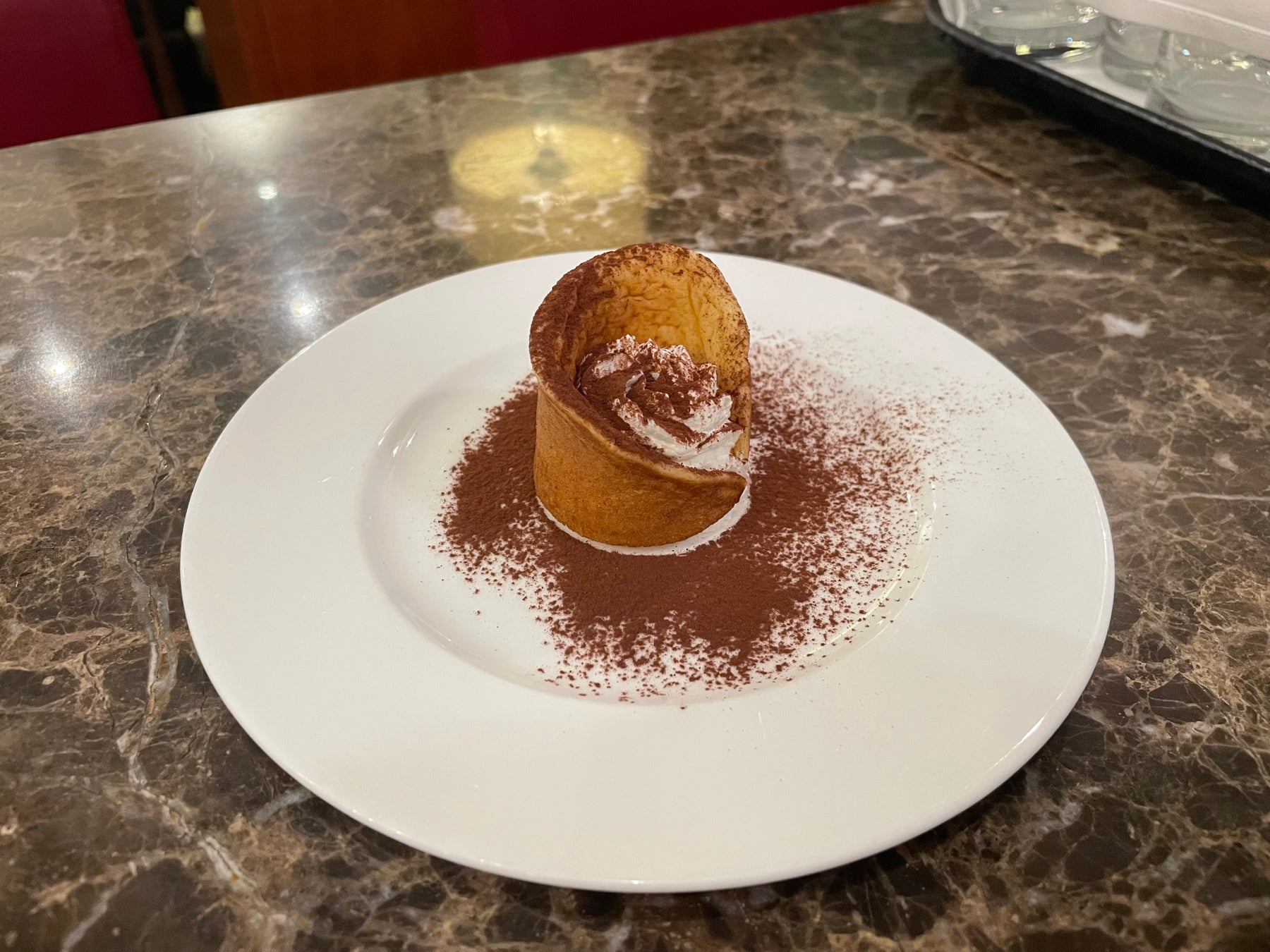 豊橋限定の圧倒的人気のお土産「ブラックサンダーあん巻き」で有名な「お亀堂」のふんわり、もっちり焼き上げたあん巻きの皮でマスカルポーネクリームを包み、仕上げにココアパウダーをかけました。皮のもっちりとした食感と、なめらかなクリームが絶妙な、一口ティラミスのようなデザートです。目の前で仕上げるロジェール限定でお楽しみいただけるデザートです。