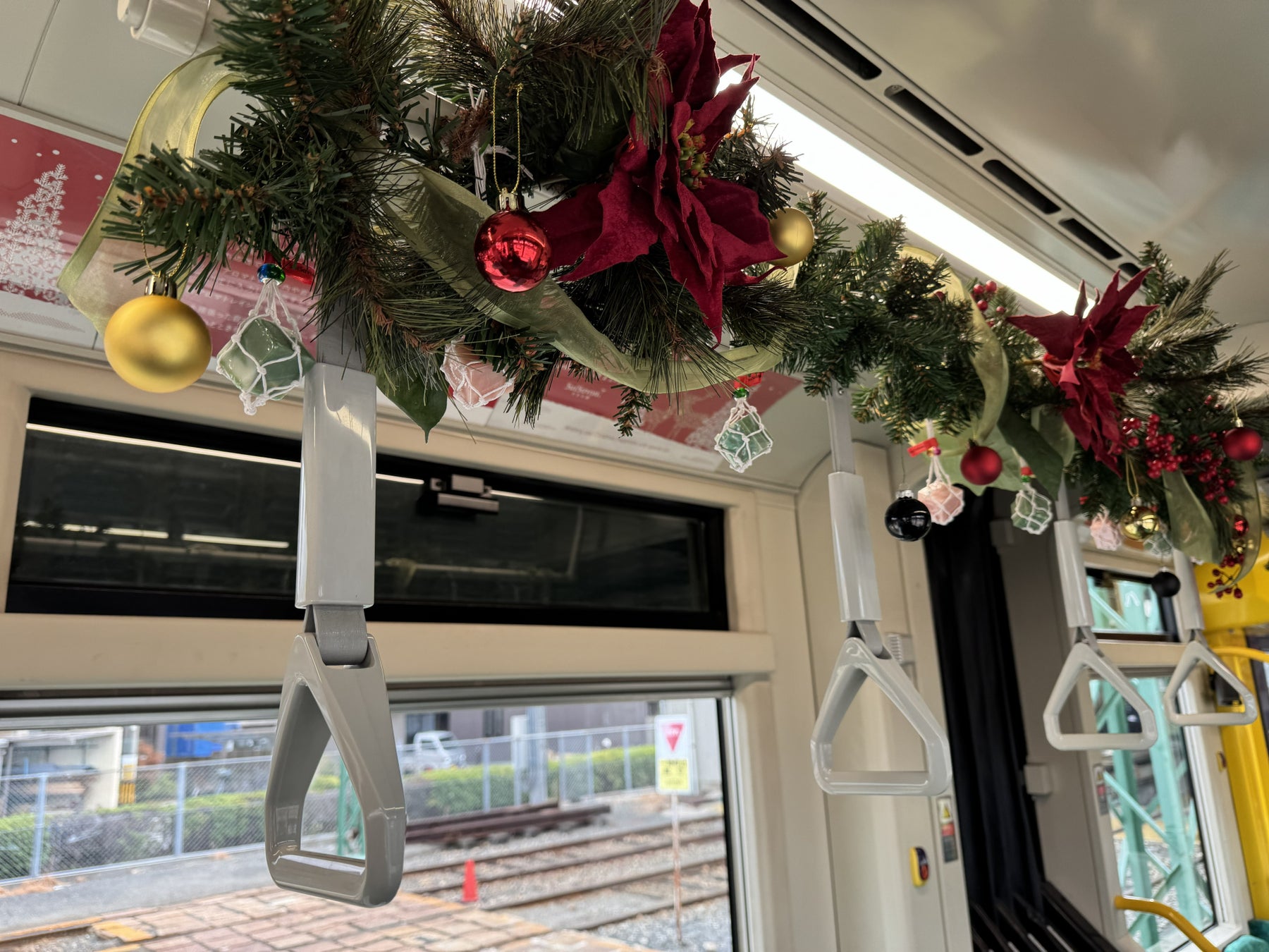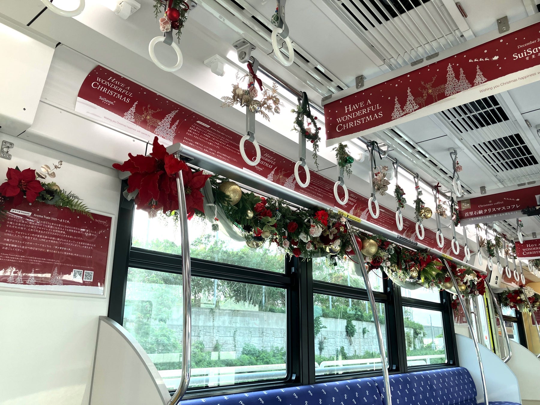 路面電車1編成をジャック。車両内にポインセチアやモミの木、オーナメントなどのクリスマス装飾とともに、首里石鹸のオリジナル製品「ボタニカルハンドメイド洗顔石鹸CUBE」を約50個装飾。