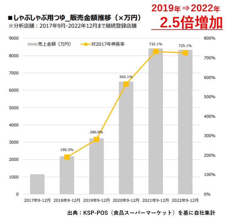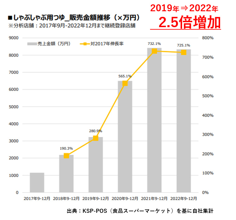 しゃぶしゃぶ用鍋つゆの市場は2019年からおよそ2.5倍の勢いで伸長しています。世界的な物価高騰の中、材料が少なくても完結し、無駄な食材が出にくいしゃぶしゃぶ鍋カテゴリーは、家計に優しい献立として今後も高止まり予測が出ています。