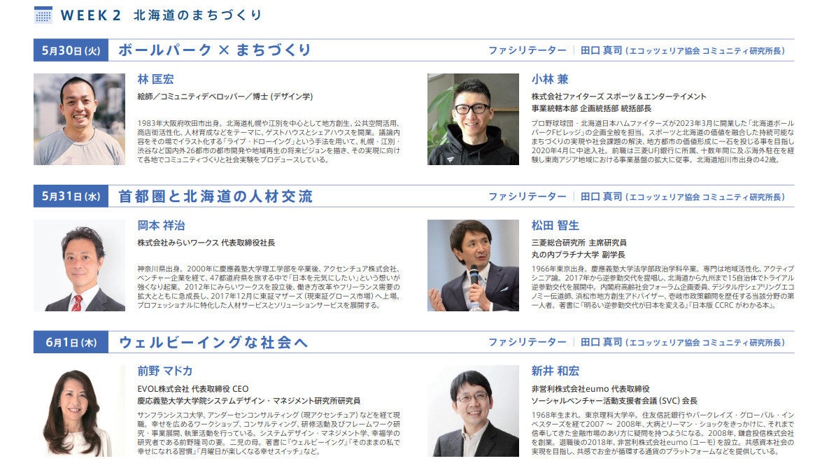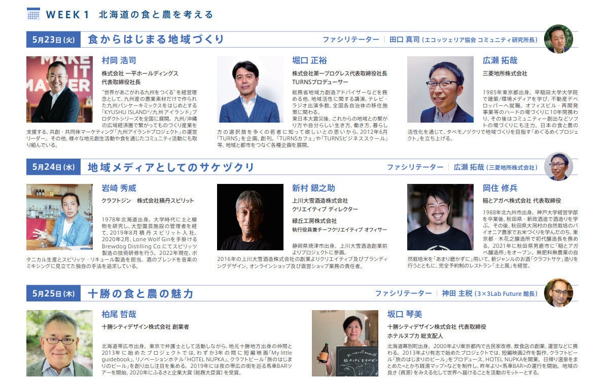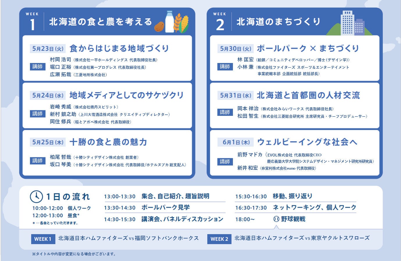 本プログラム前半のWeek1(5月23日(火)~25日(木))では「北海道の食と農を考える」、後半のWeek2(5月30日(火)~6月1日(木))では「北海道のまちづくり」をテーマに講演会、パネルディスカッションを開催。北海道で活躍されているゲストのインプットトークや、首都圏からの参加者と地域の方々との意見交換を行うほか、試合観戦を各日予定しています。