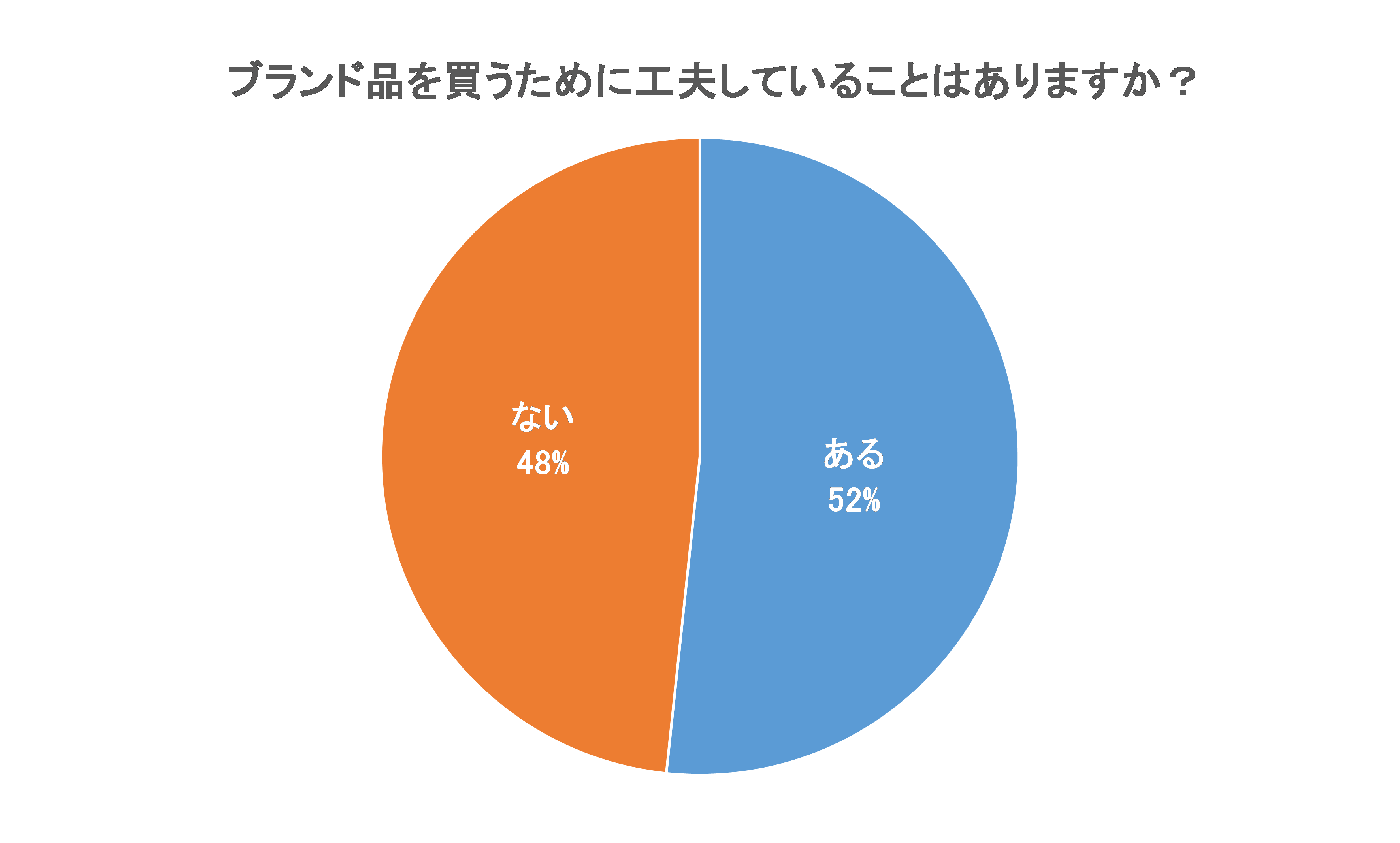 「ブランド品を買うために工夫していることはありますか? 」という質問では、「ある」が52%、「ない」が48%で拮抗する結果になりました。