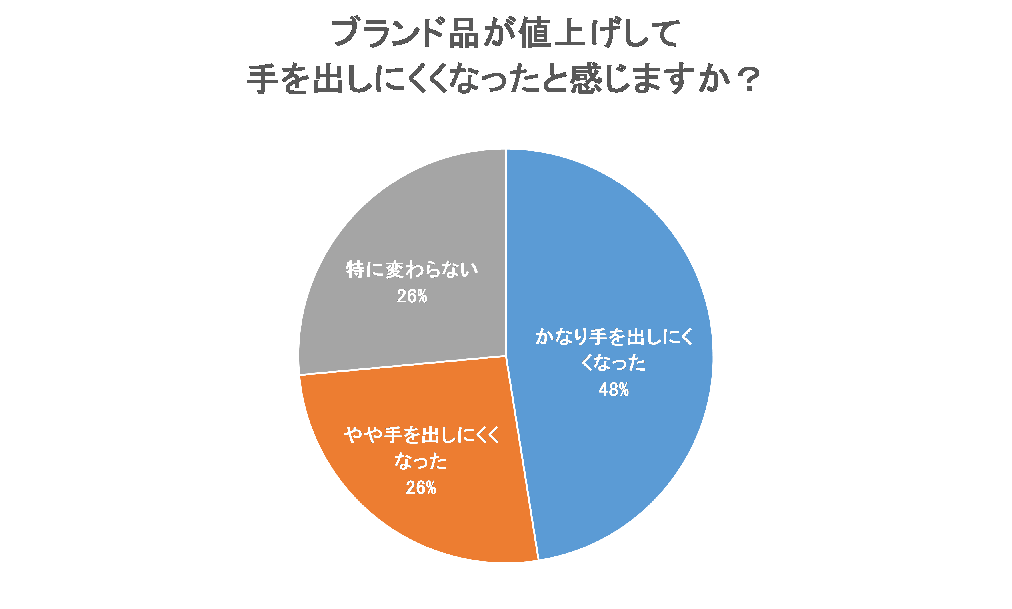「ブランド品が値上げして手を出しにくくなったと感じますか?」という質問では、「かなり手を出しにくくなった」が48%、「やや手を出しにくくなった」が26%で、全体の74%が「手を出しにくくなった」と回答する結果になりました。