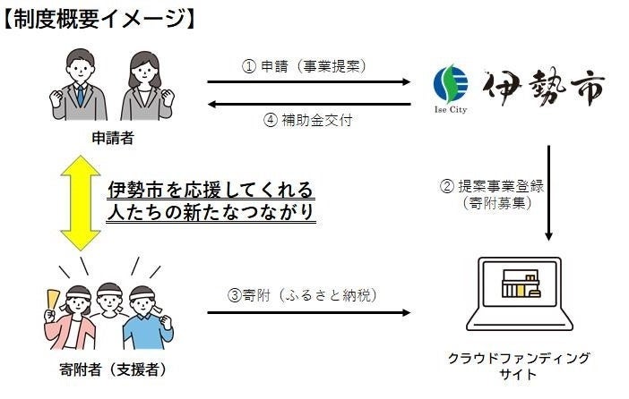 伊勢市の活性化や地域課題解決につながる新しい事業(取組)について、クラウドファンディング型ふるさと納税で募った寄附金をもとに、事業(取組)にかかる経費の一部を補助します。