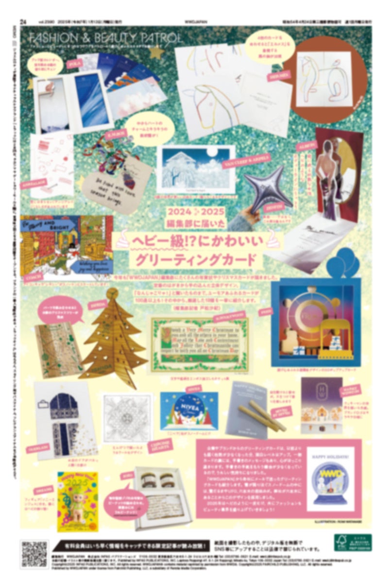 そのほかのページでは、東京・両国という下町のOEM企業が生み出した、驚きのDXに注目。海外ページでは、イタリアのファッション業界の2024年を振り返りながら、25年を展望しました。齊藤孝浩さんの「ファッション業界のミカタ」では、ナイキ(NIKE)に注目。最高益の裏に潜むDtoC戦略の功罪を読み解きました。ファッション&ビューティパトロールでは、年末年始に編集部に届いた年賀状からクリスマスカードまでを一挙に紹介しています。